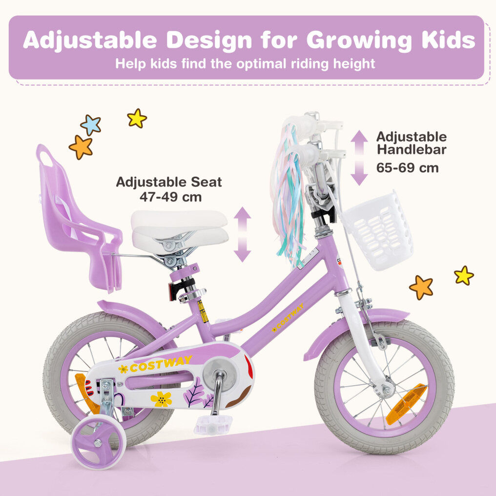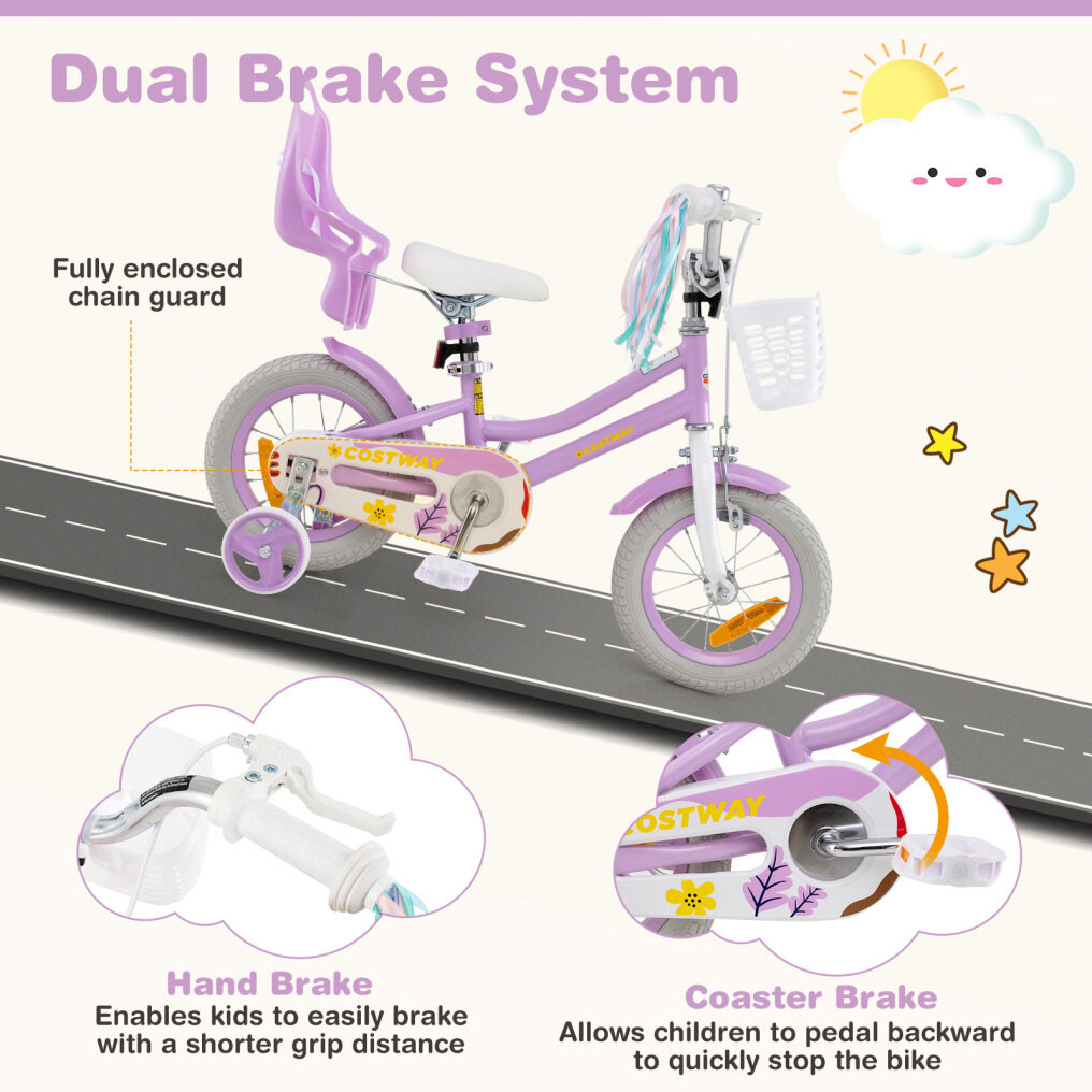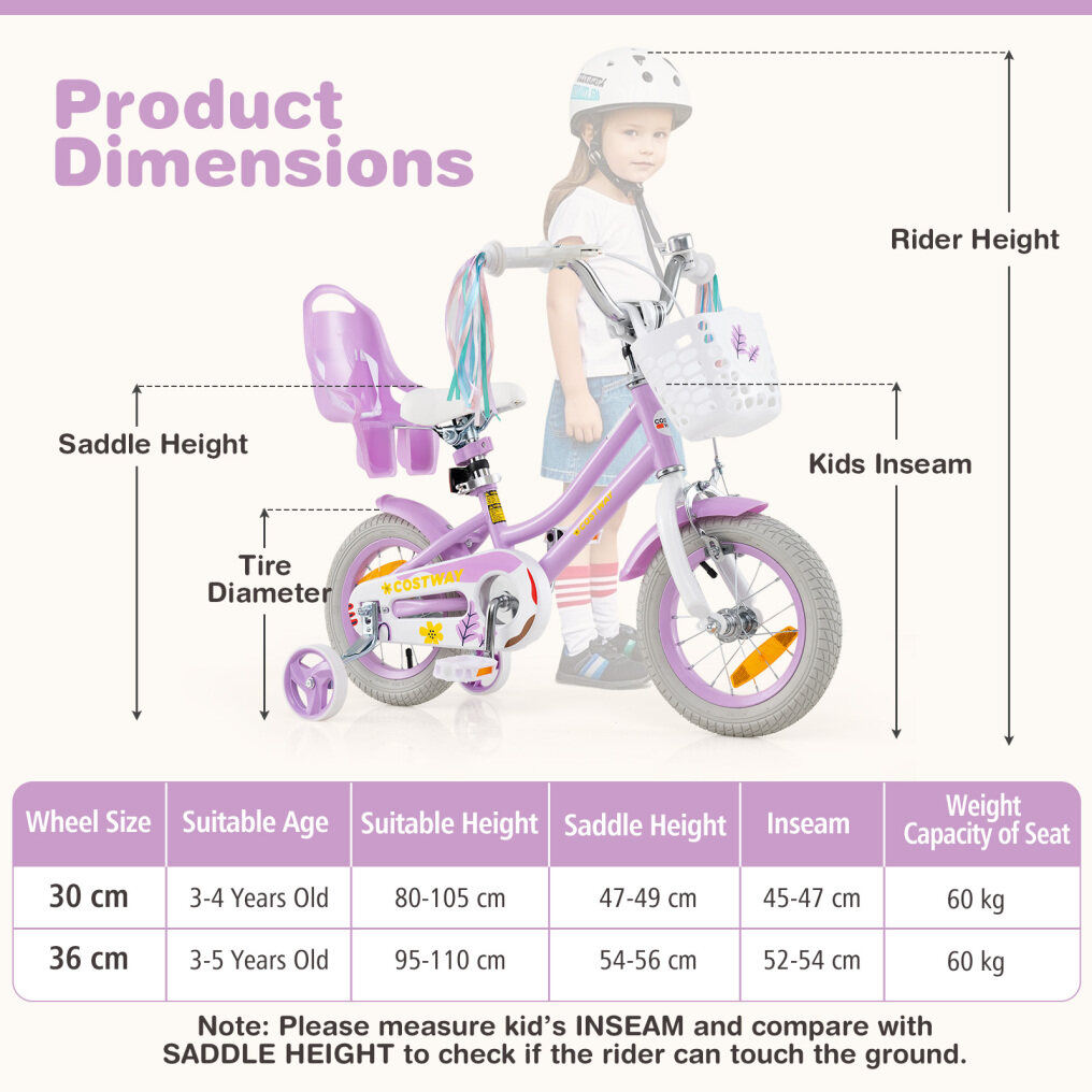 The handlebar and seat can be adjusted according to your child's growing height, which will be perfect for kids aged 3-4/3-5 years old. Thanks to a doll seat and front basket, your child can store their toys and snacks while enjoying the ride. The detachable training wheels allow little girl to safely learn how to ride. With handbrakes and a rear coaster, kids can conveniently stop the bike. The anti-slip and wear-resistant tires offer a smooth and stable ride for children. More importantly, it has AS/NZS 1927 and CPN No.6 of 2004 certification, providing you with peace of mind. Give your child the joy of riding with our charming bicycle!