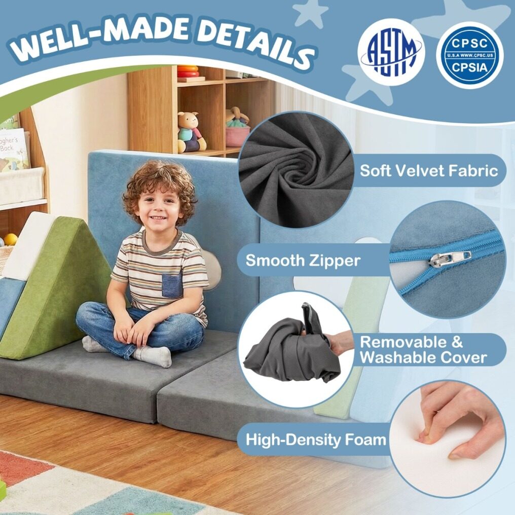 ● Premium Materials for Comfort & Safety: This 12 pcs modular kids play couch features soft velvet fabric and high-density foam, offering a cozy and supportive environment for kids. Each cushion includes a removable, washable cover with a smooth zipper, making cleaning easy.