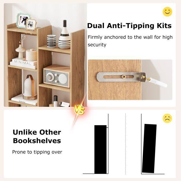 Robust Wooden Construction: The wooden bookcase is designed with 2 anti-tipping kits to ensure safety and stability. With a substantial load capacity of 140kg, this piece confidently supports heavy books and decorative items.