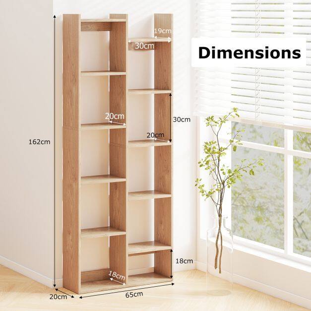 With 10 open cubes and 2 top shelves, it offers ample storage space. Unlike other bookshelves that are prone to tipping over, the shelving unit features a sturdy wooden structure and 2 anti-tipping kits for stability. It can hold up to 140kg. The tree-shaped design adds a modern aesthetic to your decorations, making it a functional and artistic display piece. This bookshelf fits seamlessly into your living rooms, bedrooms, studies, and more. The included screw hole covers ensure a clean appearance. The protective foot pads are friendly to the floor.