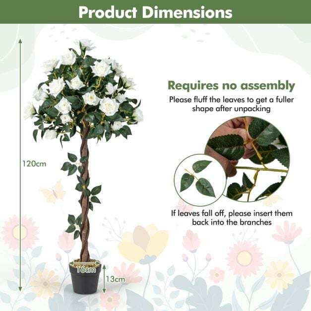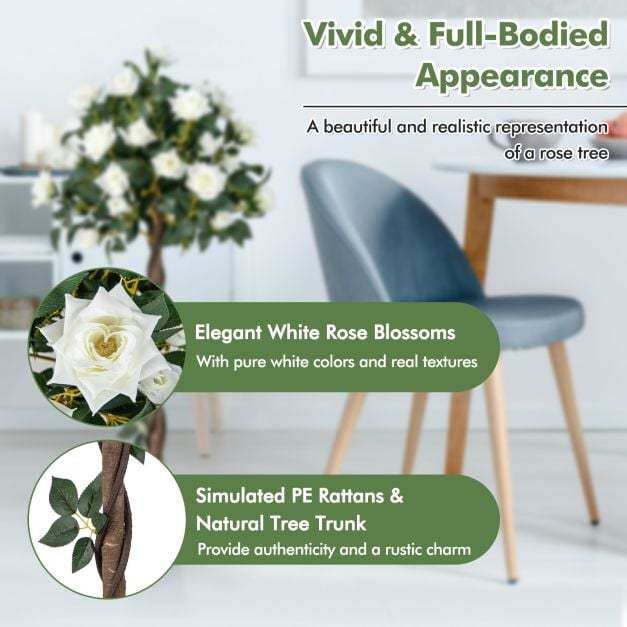Vivid and Full-Bodied Appearance: The 120 cm artificial flower tree features elegant white rose blossoms with pure white colors and real textures, adding a touch of nature to your home. Moreover, it adopts simulated PE rattans and a natural tree trunk, providing authenticity and a rustic charm.