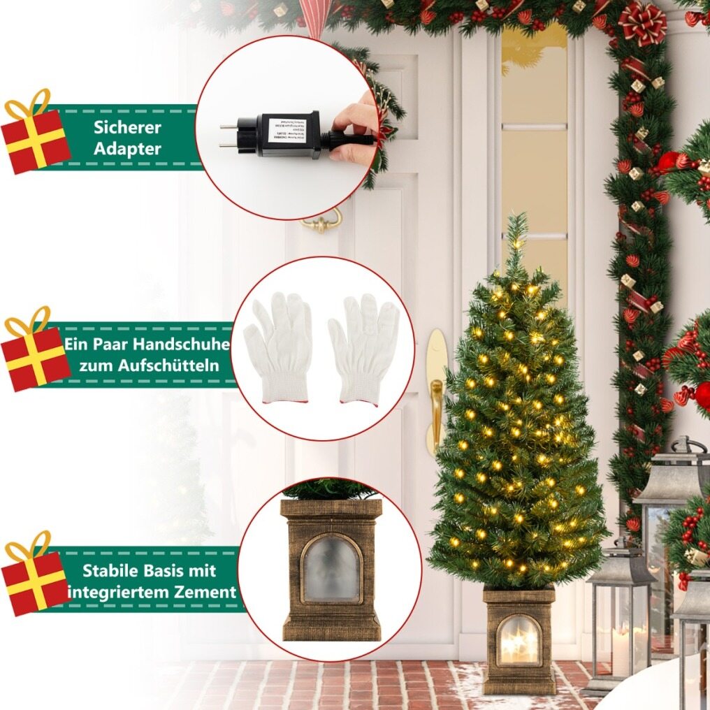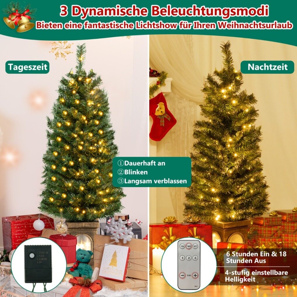 Elevate your Christmas spirit with our stunning 120cm illuminated potted artificial Christmas tree. This exquisite tree showcases 160 green branch tips accented by 100 warm white LED lights, creating a cozy and inviting atmosphere. The retro style urn base adds a touch of sophistication to your festive decoration. Additionally, with 3 lighting modes, you can easily create the perfect atmosphere for your Christmas celebrations. And it includes a remote control and controller that allows you to easily adjust the lighting effects to your preferences. The brightness can also be adjusted. In addition, unlike other flammable and unsafe materials, we use flame retardant and safe PVC materials that provide both safety and durability. And the stable base with integrated cement ensures good stability. This versatile tree is perfect for different scenes and will add a festive touch to any room. Enjoy fun decorating time with your family and friends.