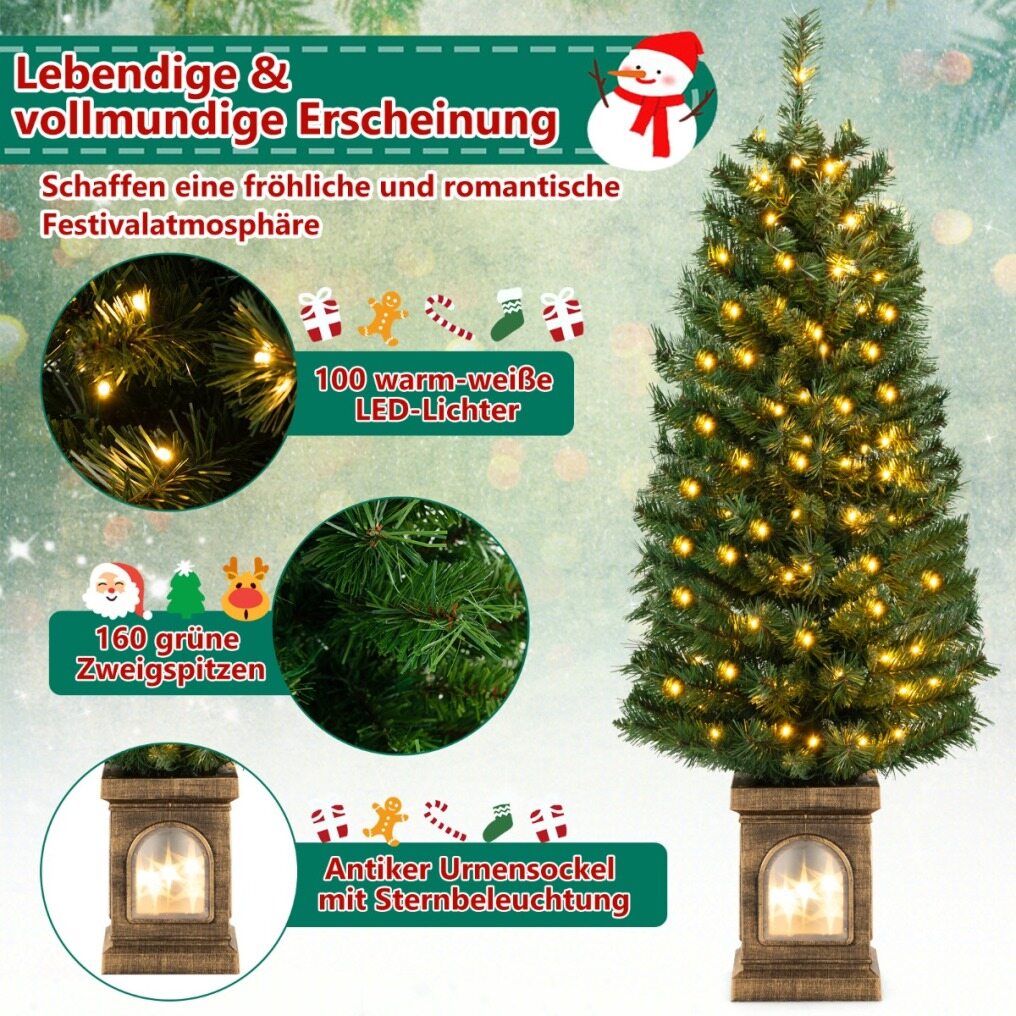 VIBRANT AND FULL APPEARANCE: The 120cm pre-lit artificial Christmas tree in pot features 160 green branch tips and is decorated with 100 warm white LED lights, creating a cheerful and romantic festival atmosphere. And it comes with an antique starlit urn base that will add a touch of elegance to your Christmas decorations.