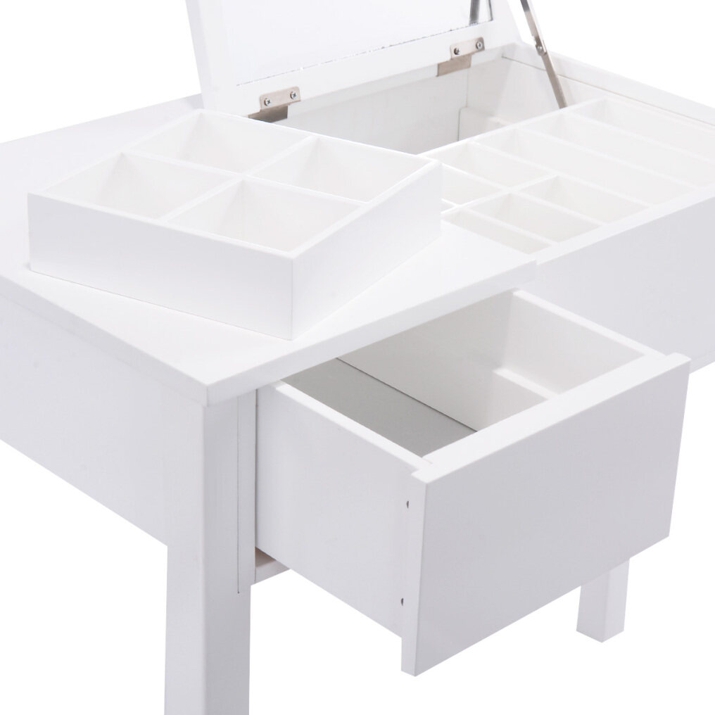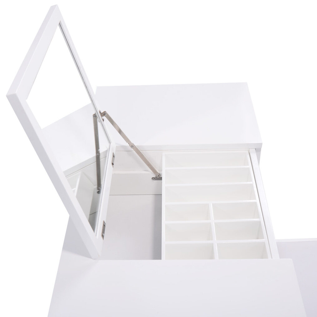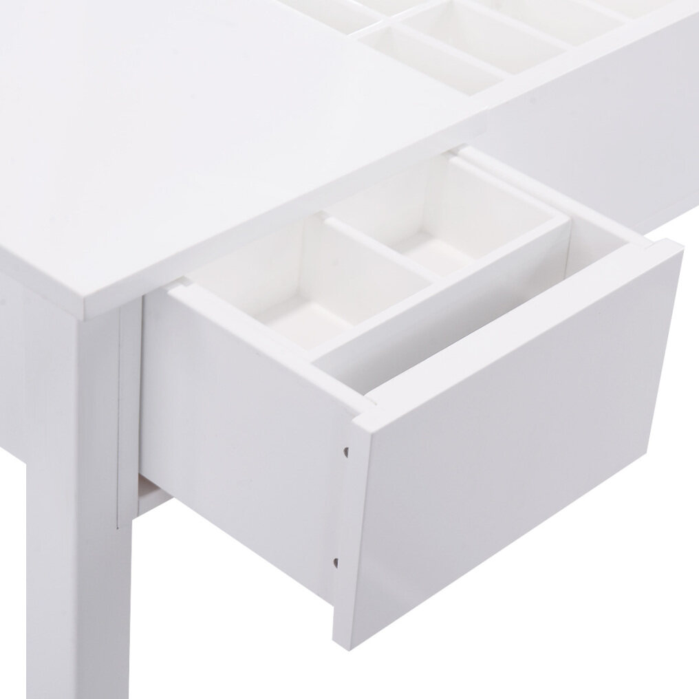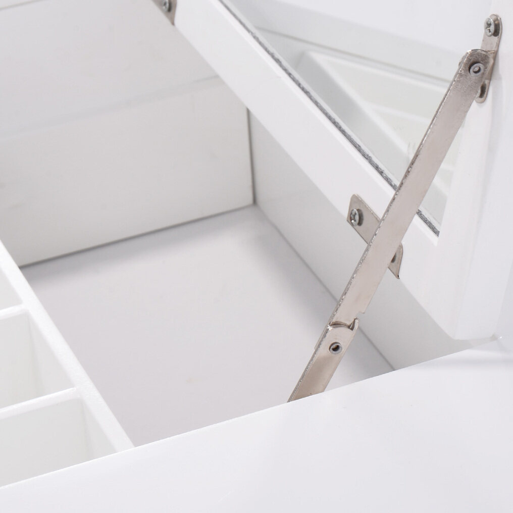 Made of thick solid MDF, this vanity table set is sturdy and durable enough to serve you a long time. Lift up the middle of the table top to reveal a mirror and you can also find there are many hidden storage boxes for your jewelry and ornaments. The dressing table also has 2 drawers on each side providing plenty of storage space. The spacious tabletop is large enough for you to display and organize your all kinds of cosmetic and makeup tools. The big mirror easily reflects images clearly.