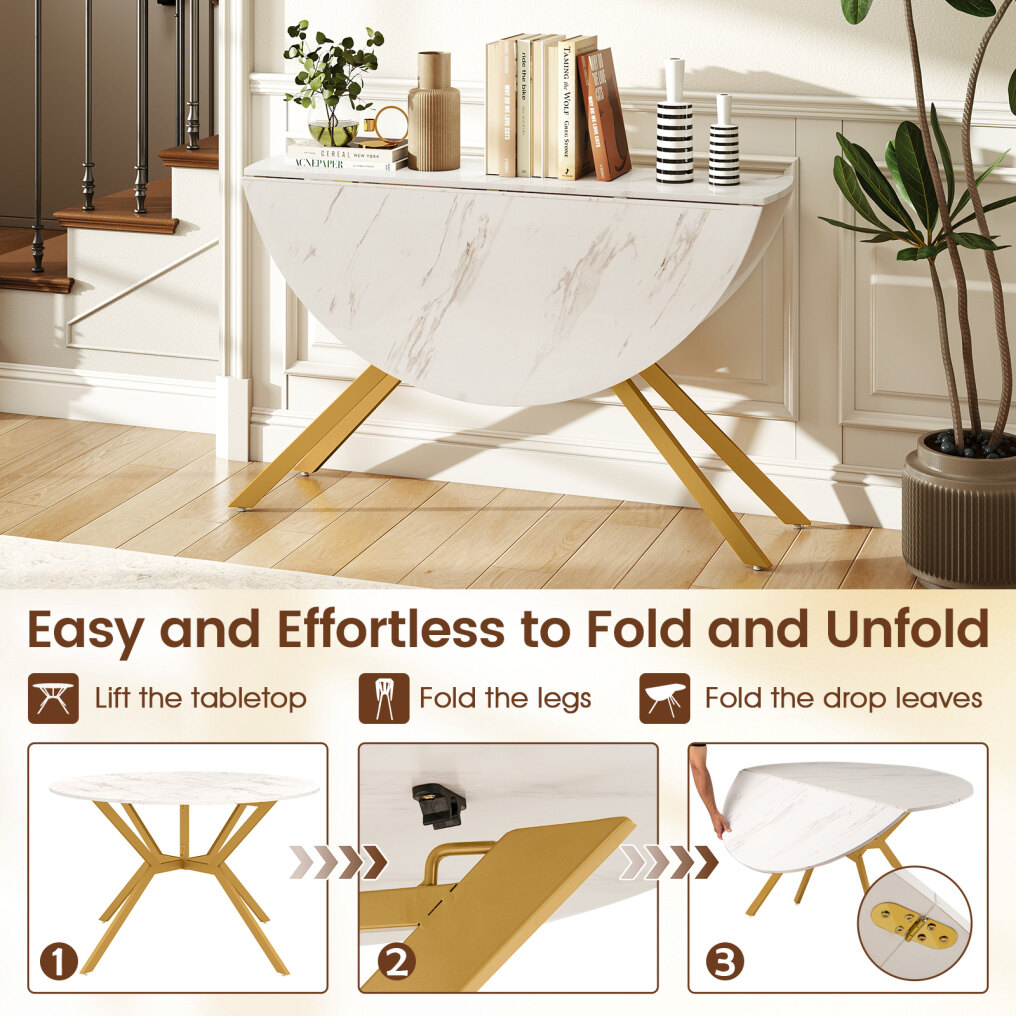 ● Versatile Application: This round table serves as a spacious dining table fully opened, a convenient writing table half opened, transforms into a sleek console table or a charming sofa side table completely folded. It could cater to your dining, work, study, and entertainment needs.