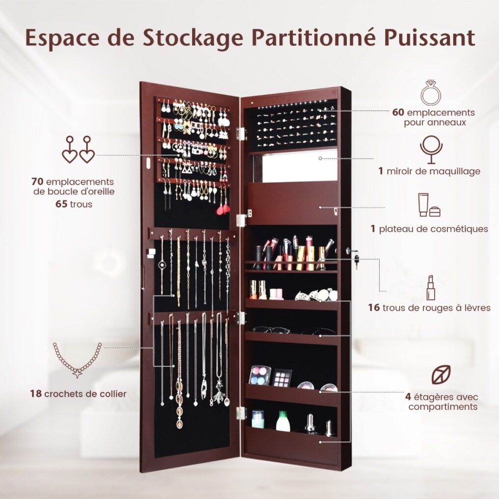 Our LED jewelry cabinet with mirror is multifunctional, combining with mirror, door and LED light, becoming an eye-catching piece of art specially designed for all your valuables! The jewelry cabinet helps you keep your jewelry organized and prevents it from getting tangled. The lockable design protects your jewelry from naughty kids. The built-in 12 LED lights add a touch of luxury and beautify your jewelry in the cabinet. The black velvet lining effectively protects the jewelry from scratches and is also easy to maintain with a soft dry cloth. The jewelry cabinet is convenient for trying on your clothes or jewelry when you are preparing for a trip or attending a formal event. Besides, its chic and elegant design matches the decor of your bedroom. Hang it on the wall or on the door and you will find it is perfect for small spaces to save space. Our jewelry cabinet will be a great addition to your master bedroom and make your life easier and more convenient!