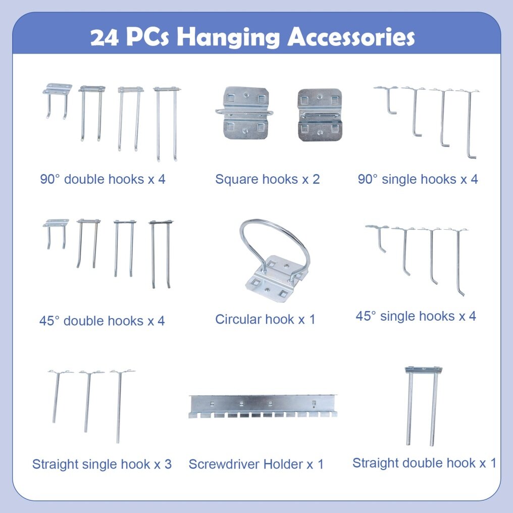 Pegboard with 24 PCS Accessories: This work table is complete with 3 pieces of functional pegboards which offer extra storage space. The orderly arranged hanging holes on the pegboards are precisely crafted with square shape for higher stability. It also comes with a screwdriver holder and 23 hanging hooks in different shapes (single/double/square/circular) and tilt angles (90°/45°/straight).
