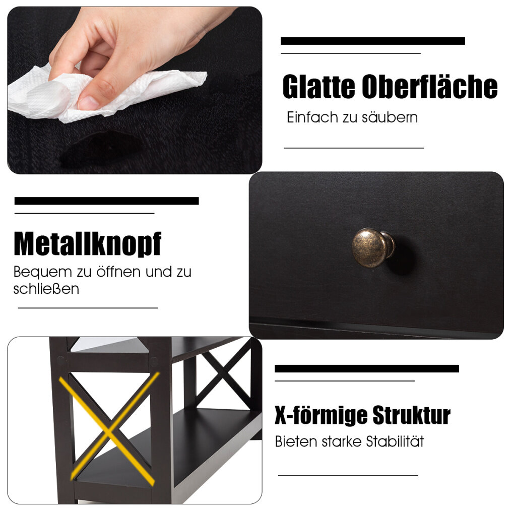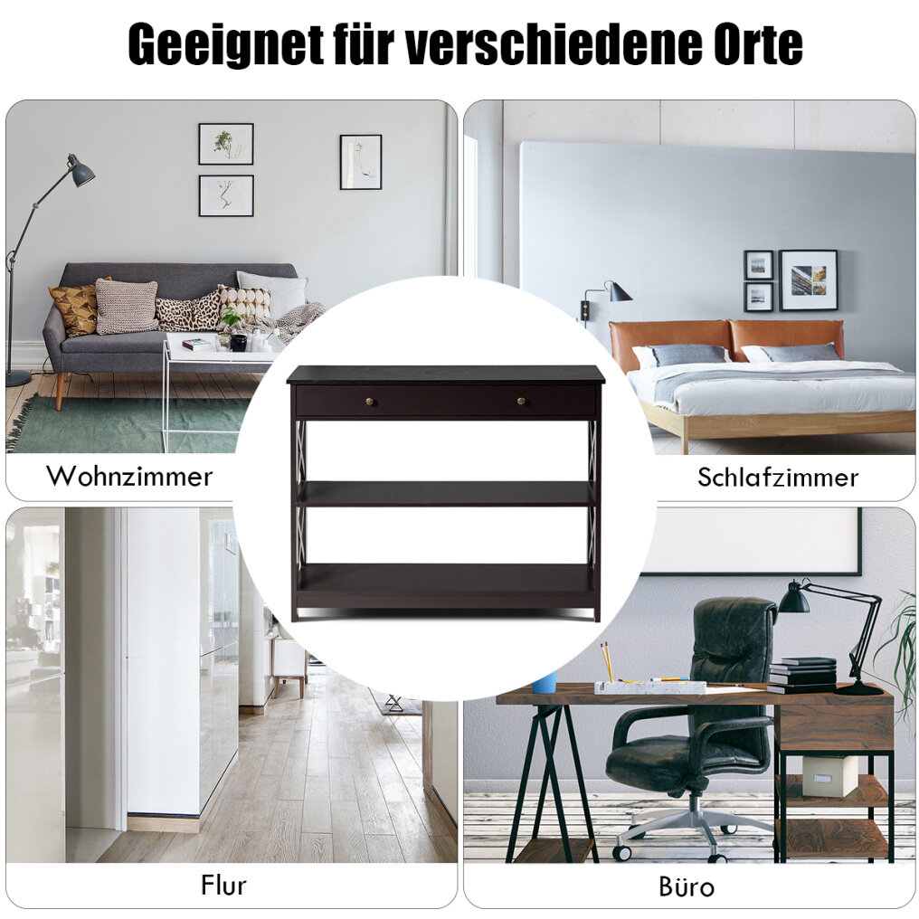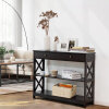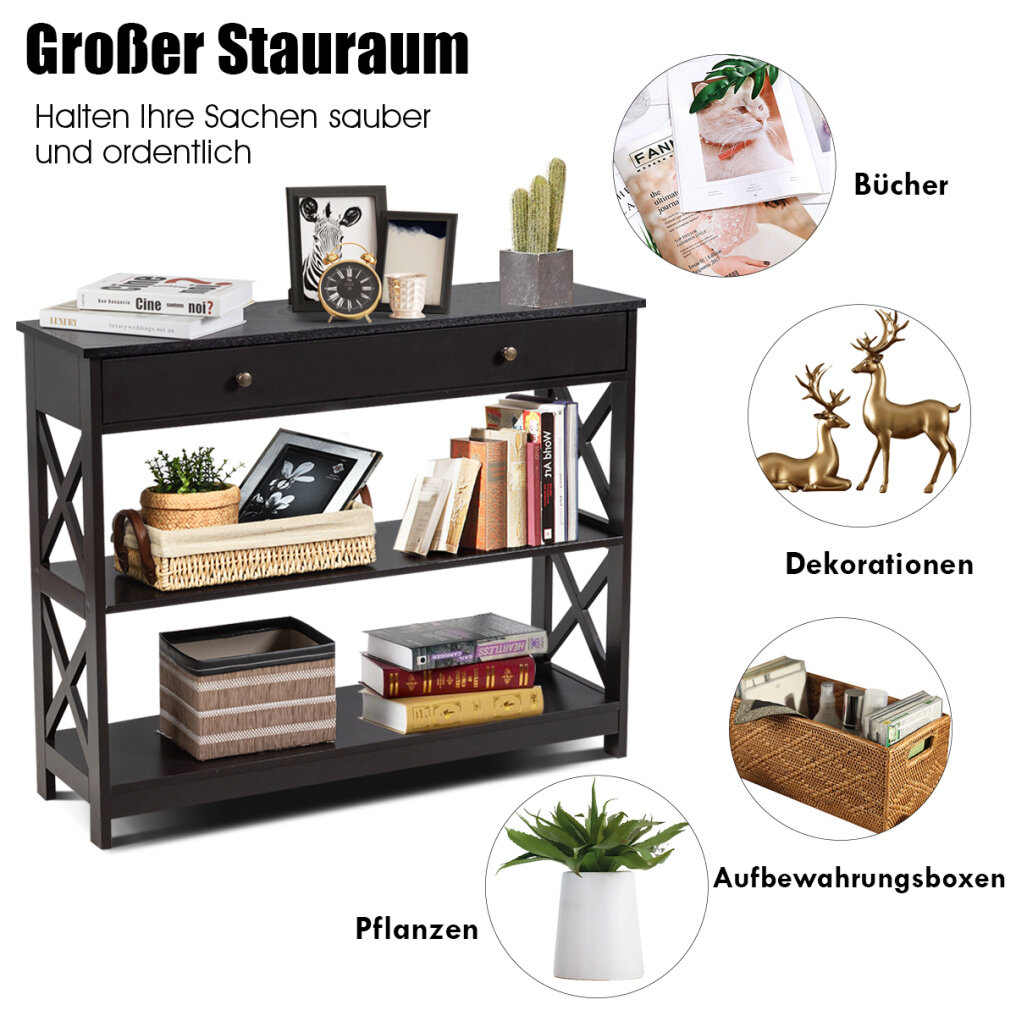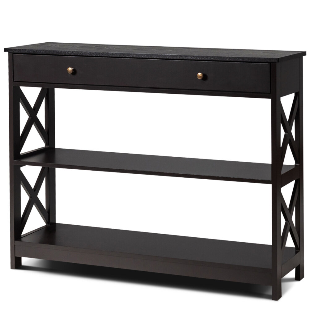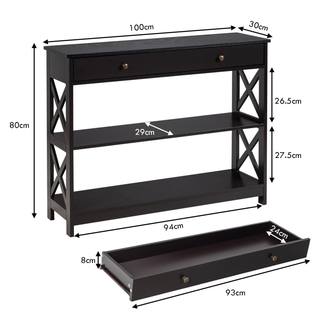 Designed with a spacious tabletop, a large drawer, and 2 storage shelves, this wooden table comes with ample storage space for your belongings, such as keys, sunglasses, photos, and more. This premium entryway table is durable, stable enough to hold up to 209 lbs. Measuring 39'' x 12'' x 31'' (L x W x H), this 3-tier table will make for a timeless addition to your living room, hallway, or entryway.