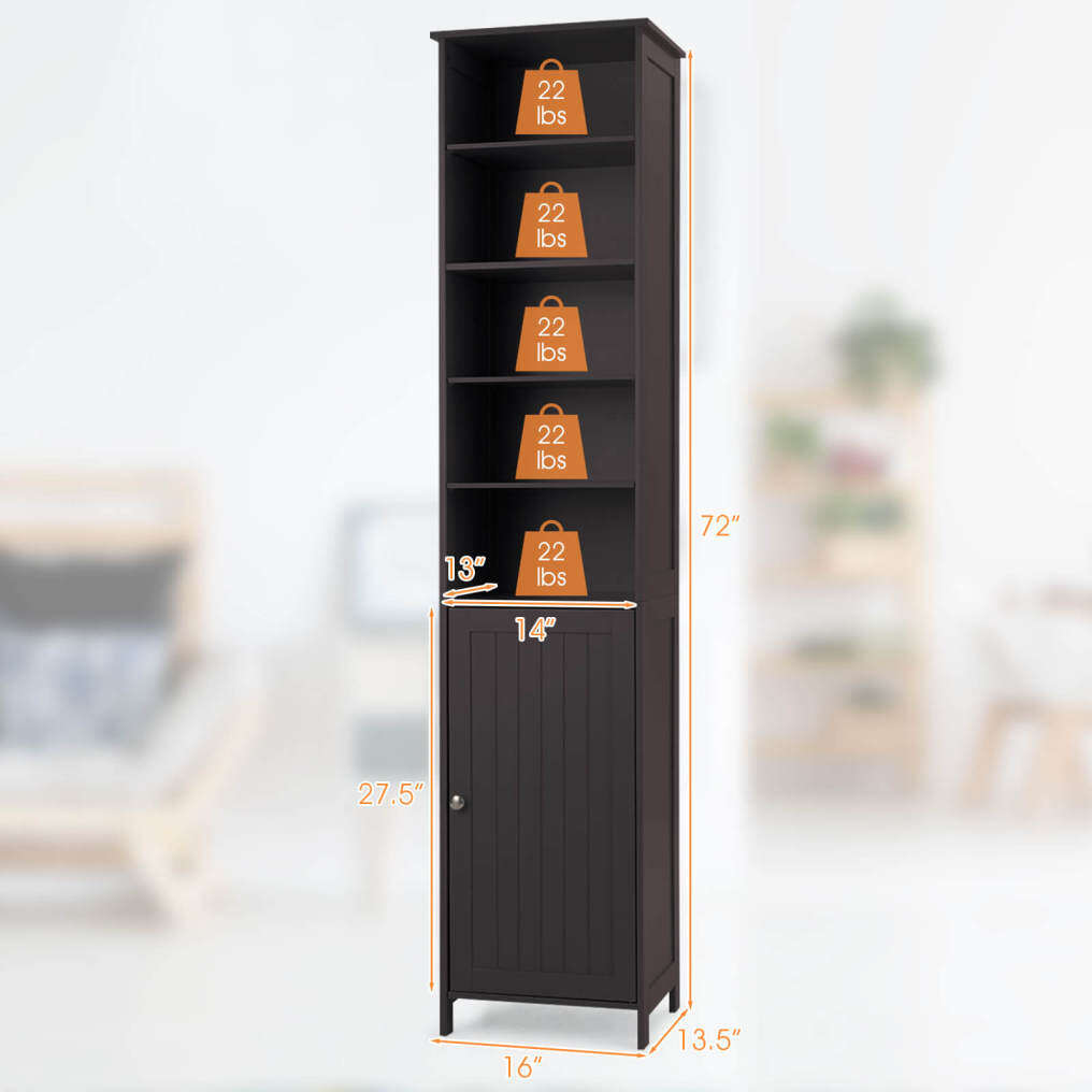 ● Large Storage Capacity: The dimension of bathroom tower storage cabinet is 16''X13.5''X72'' (LXWXH). There are five shelves and one cupboard with door of this cabinet, which can provides an excellent storage space option for any kind of bathroom with restricted area. it can accommodate all your toiletries, such as cosmetics, shower gel, shampoo and towels, perfectly save space for your bathroom.