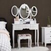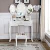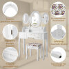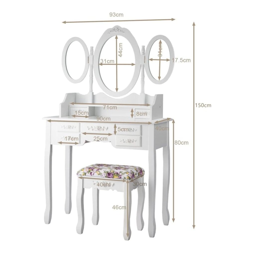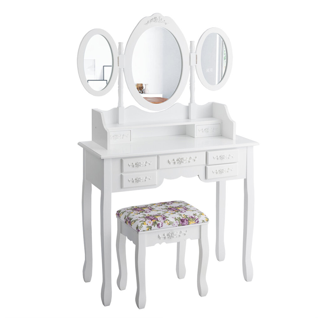 This vanity set will never let you down with charming appearance as well as its powerful practicality. Made of thick density board and solid wood, this dressing furniture set is sturdy and durable enough to serve you long time. There are 3 mirrors can be folded or rotated to get better light when you are making up. Featuring with 7 drawers with exquisite knob, you can store your jewelry and ornaments in order. And the spacious tabletop also has enough space for storing your Cosmetic and make up tools. Designed in elegant and gorgeous style, the whole set will be a perfect décor for your home.