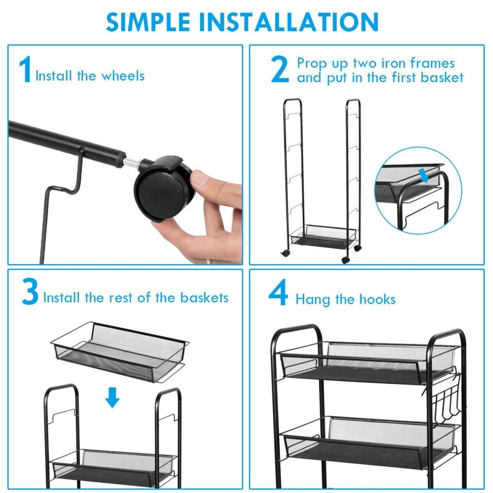 Easy to Assemble and Clean: Thanks to the simple structure and clear instructions, you can assemble the rolling shelf in a short time. The waterproof material is easy to clean and maintain. The baskets drain water and moisture well and keep the items dry.