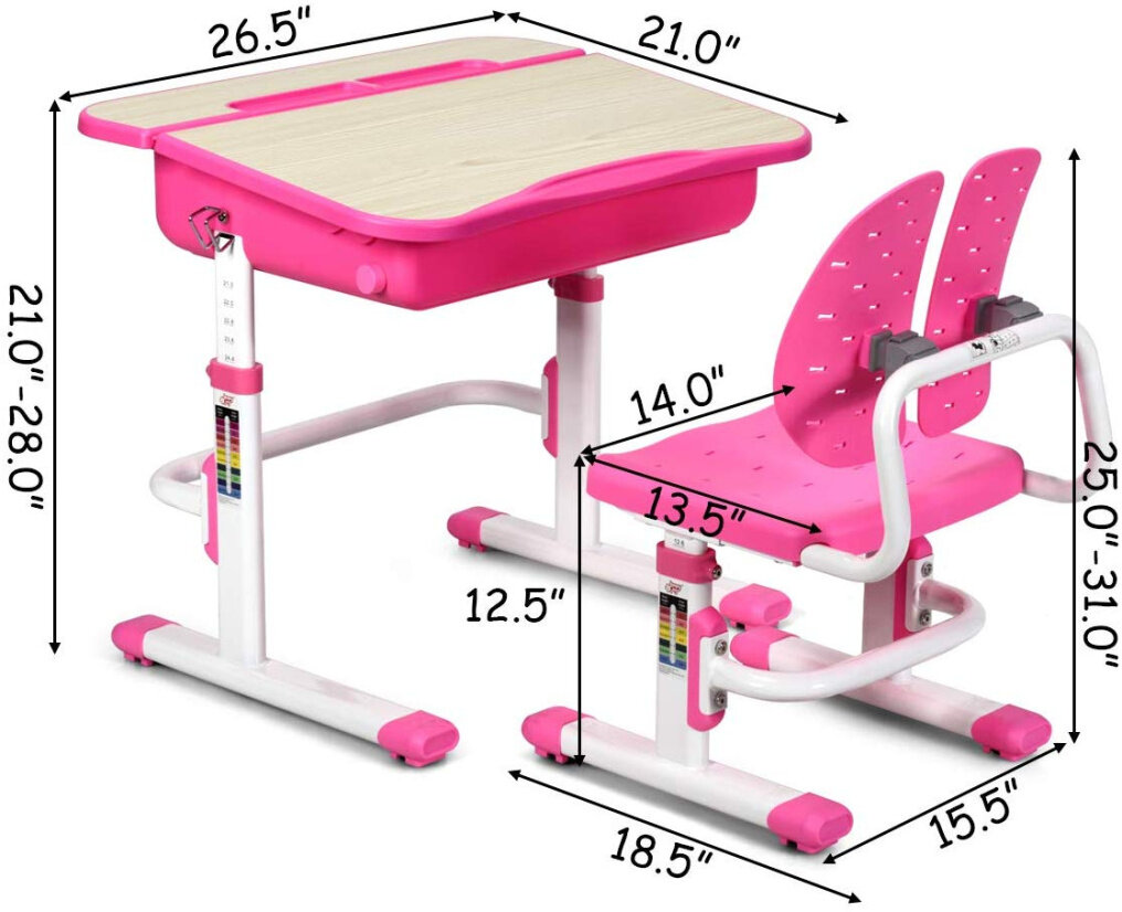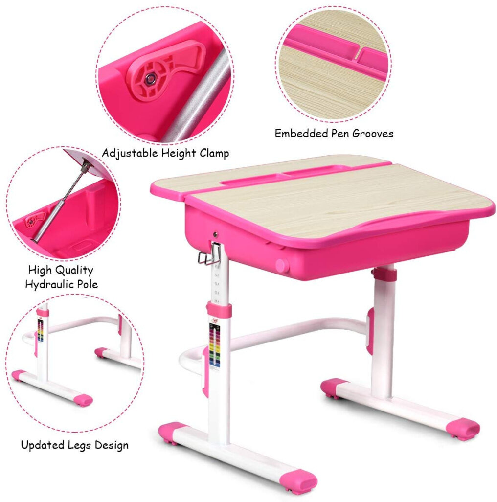 Made of premium materials, this set is sturdy and safe. Legs constructed with high quality steel frame and the updated leg reinforcement design and non-slip pads prevent chairs from tilting back and sliding. A hook on the side of the table allows you to hang a backpack or water bottle. The height of the whole desk and chair can be adjusted as child growing up. It also comes with a large storage drawer for storing books, papers and bookshelf for additional space. This student table is your best choice! It can help children correct their posture, protect their eyesight and develop good study habits.