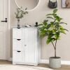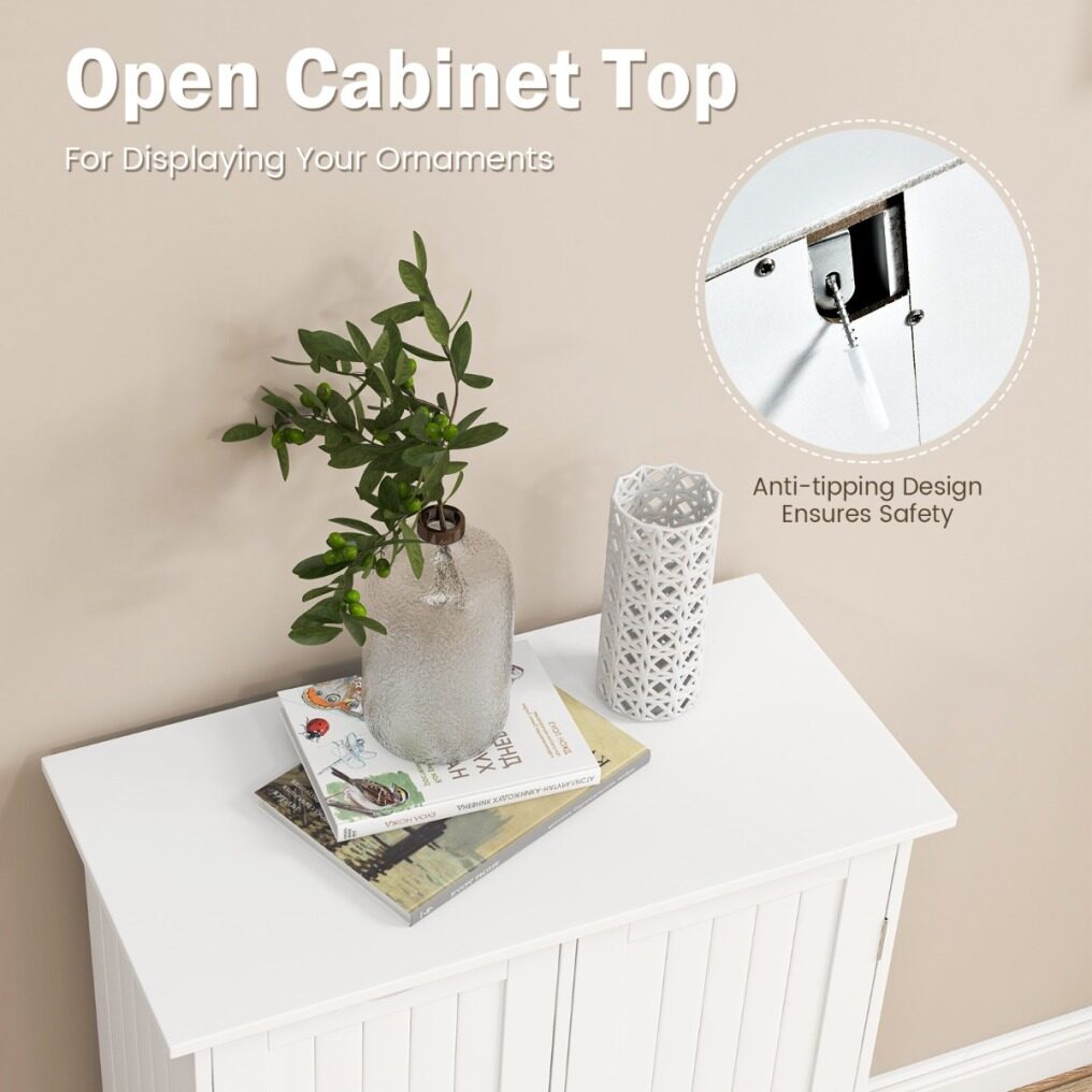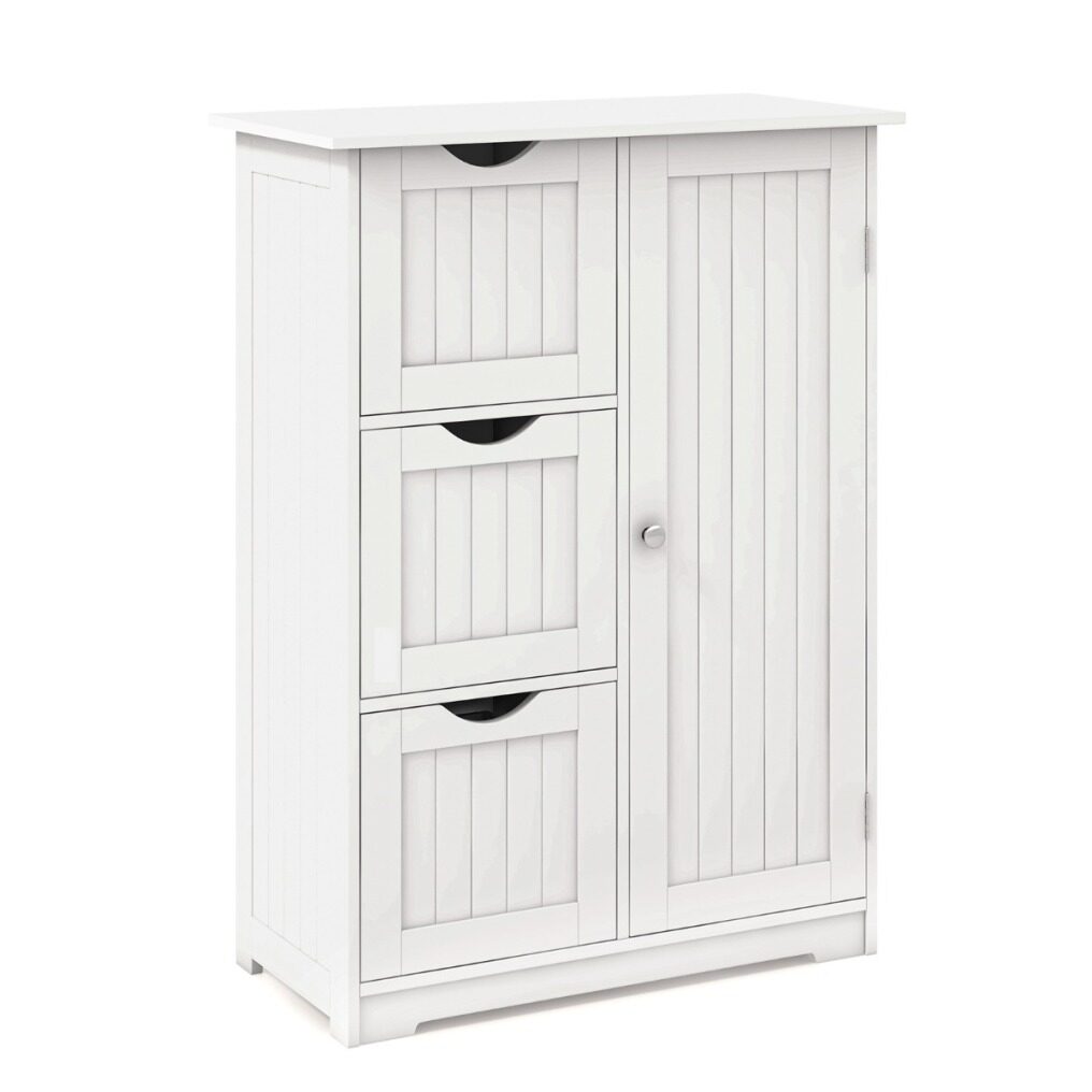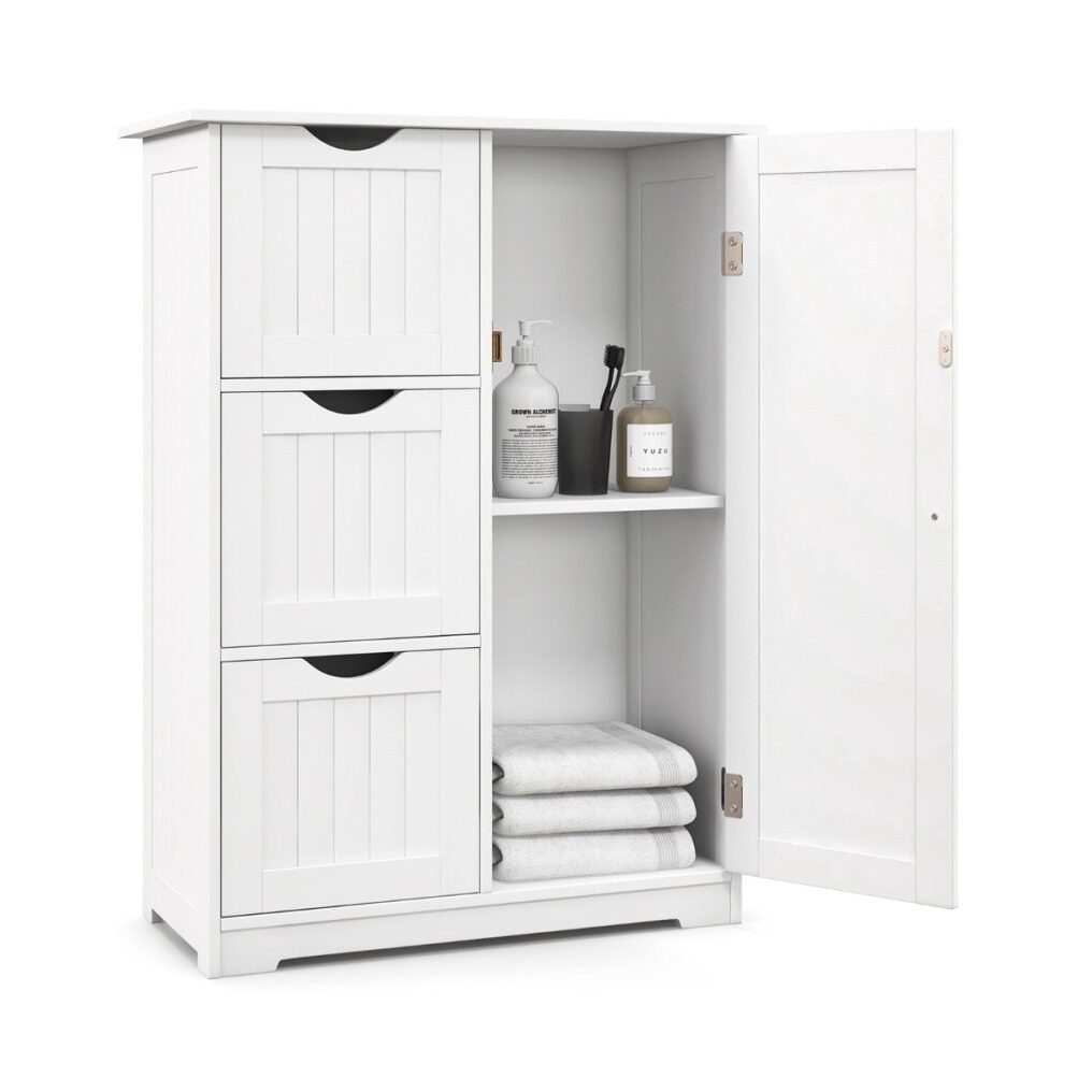 3 drawers and a cupboard with enough space are great to store items. And the shelf in the cupboard can be detached or adjusted in three positions. Made of premium density board, the cabinet is sturdy and durable for long time using. With tilting prevent device, the cabinet is not easy to fall when you use it. In addition, the door of cupboard is equipped with magnetic button to prevent items from falling and round handle for opening and closing easily. This multipurpose cabinet not only can be used in bathroom, but also can be placed in your bedroom, living room and kitchen to be a free-standing organizer.