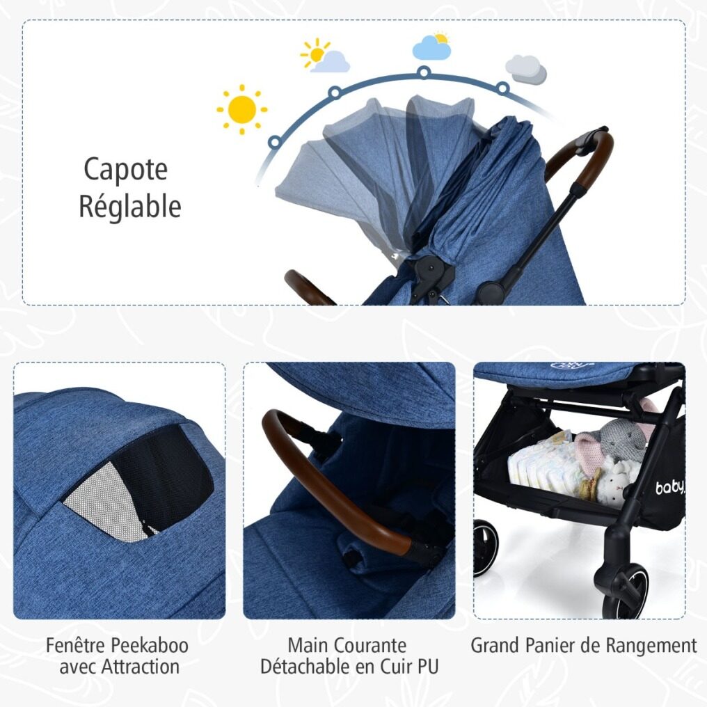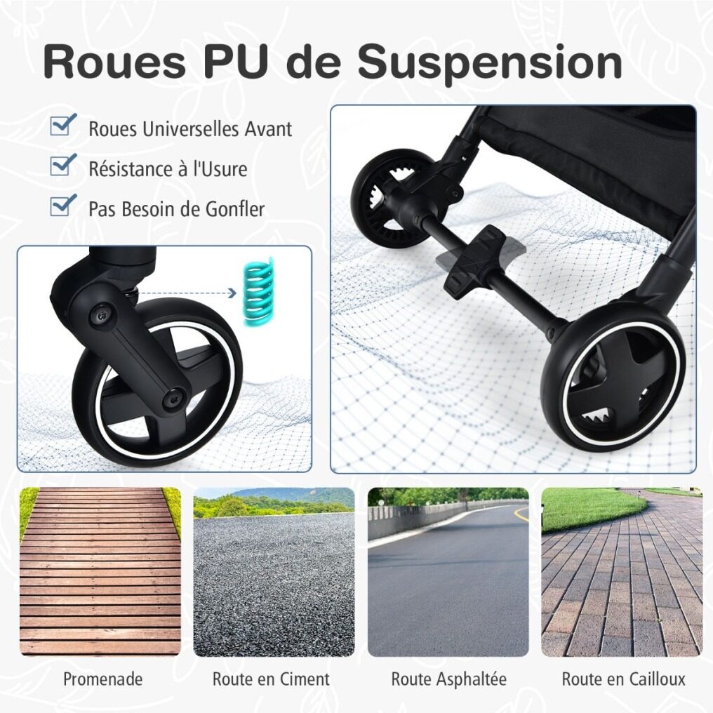 This infant stroller is not only designed for your baby, but also brings you a lot of convenience. For your little one, there are adjustable canopy, 5-point safety harness, comfy seat cushion and suspension wheels, which bring coziness and security for him/her. As for your convenience, this pushchair stroller comes with a large storage basket and one-step brake. Additionally, based on your little one's various demands, you can adjust the backrest from 100° to 145° and the footrest to 2 different positions. What’s more, the face-inside mode and face-outside mode make this infant carriage more flexible during use.