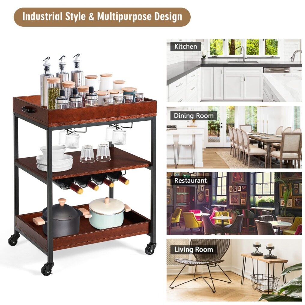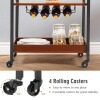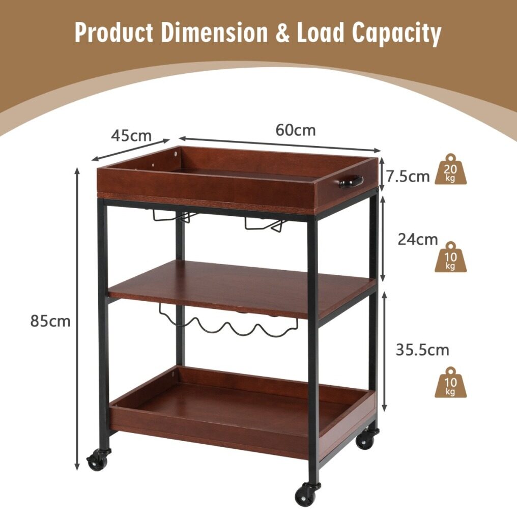 Bar Cart with Ample Storage Space: The bar serving cart with 3-tier open shelves provides large storage space for your food, wines, desserts, kitchen supplies or any other dining essentials, making your kitchen or dining space neat. Besides, 2 rows of glass holders and a single wine rack can hold 6 glasses and 4 wine bottles.