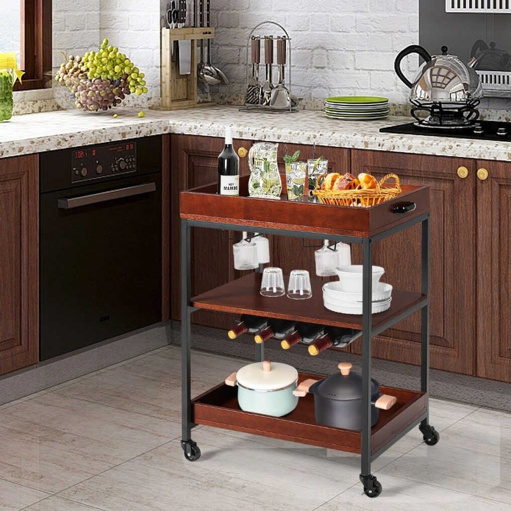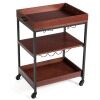 Made of high-quality wood board and a sturdy metal frame, the cart is extremely durable with greater bearing capacity. The three-tier structure provides a lot of storage space, and you can place items layer by layer according to your needs. With a two-row wine cup holder and single-deck wine rack, the cart makes the kitchen more organized. Equipped with 4 rolling casters, it’s easy to move in the kitchen. It is ideal for kitchens, bars, restaurants and more.