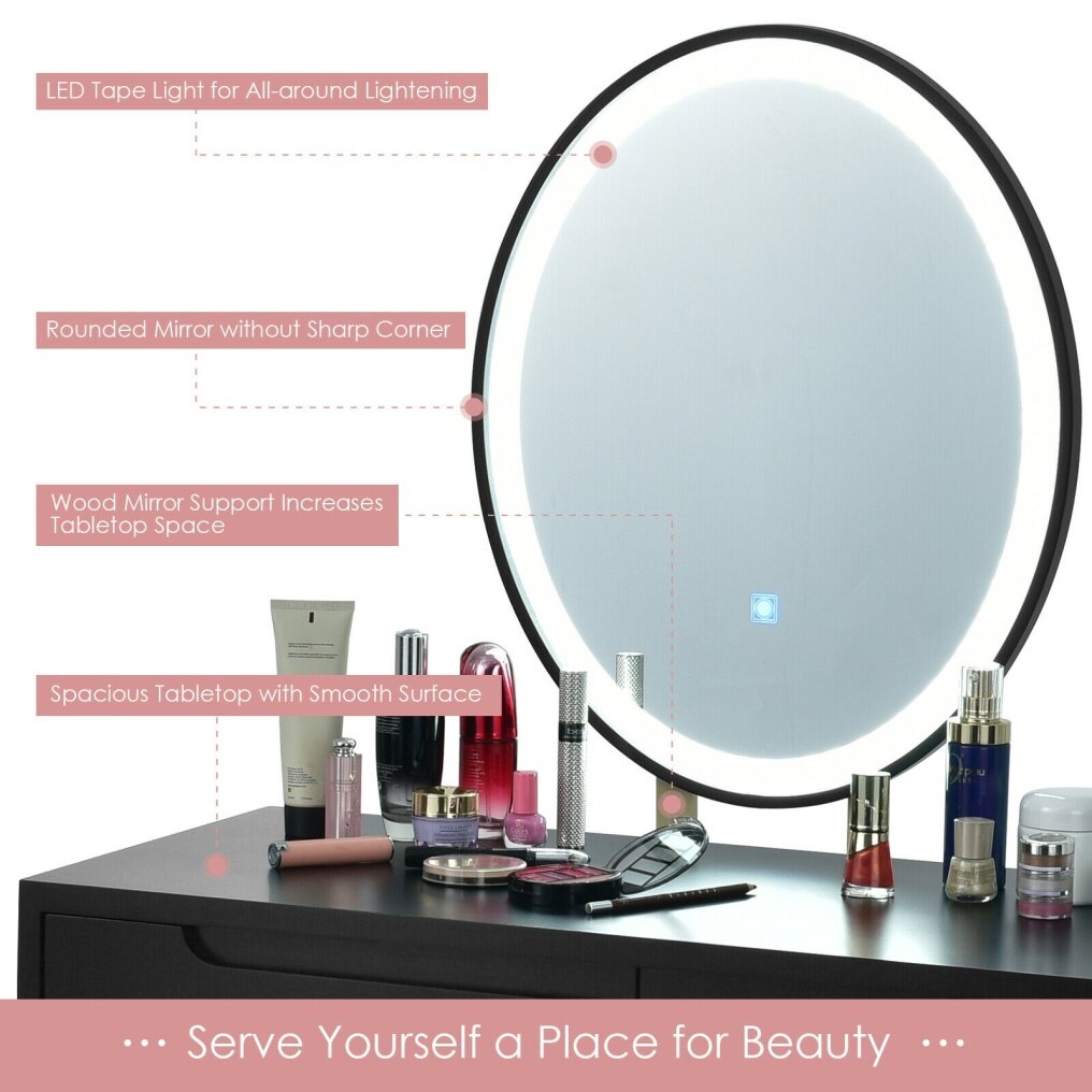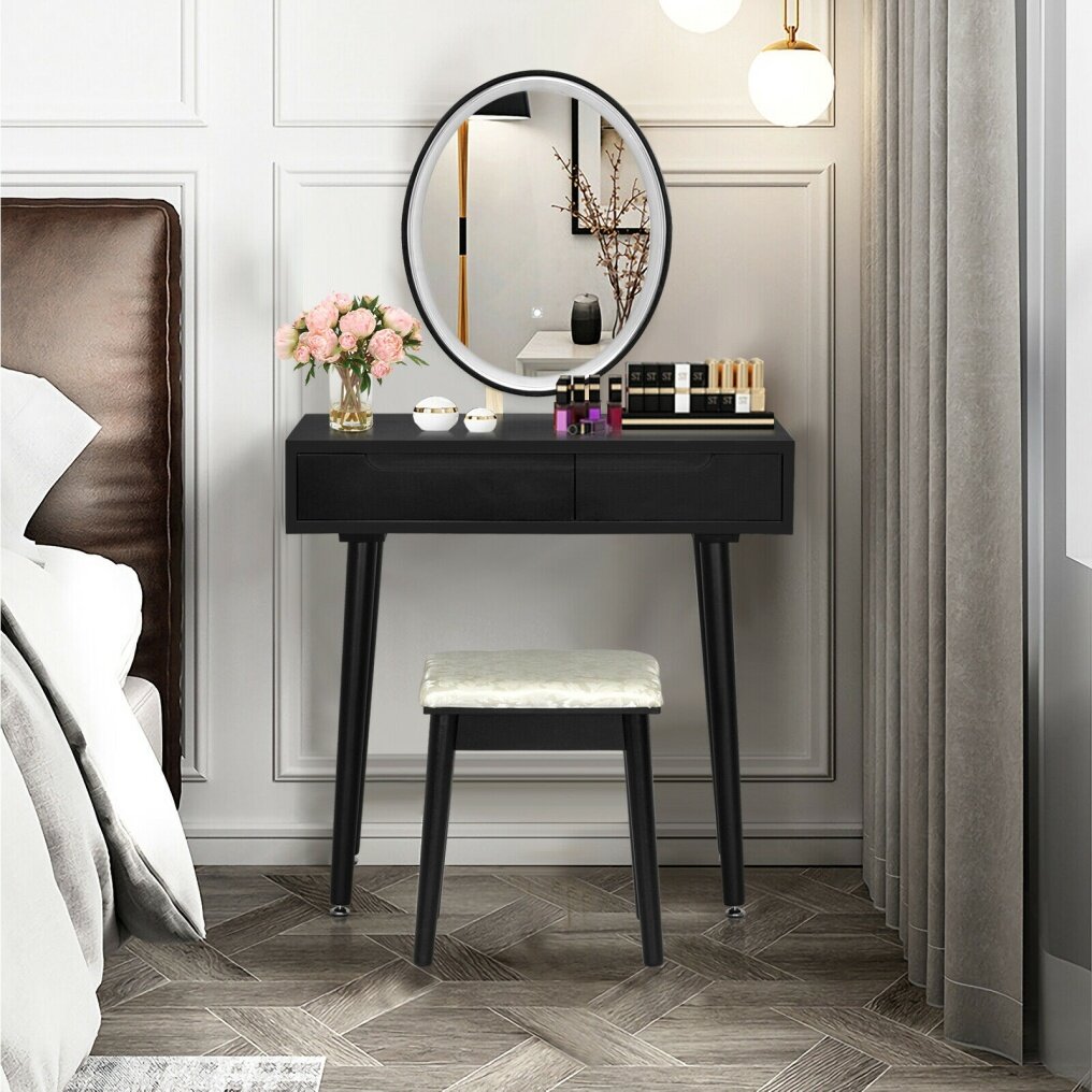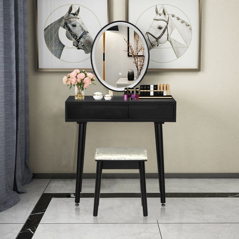 Simple lines and gently polished legs give transitional grace to the vanity table set. It is an ideal choice for those who are purchasing for fashion and practical function. Two drawers are designed in different sizes, one for your beauty tools, the other for your small items like cosmetics and jewelries. The LED lights give many angles to help perfect your look.