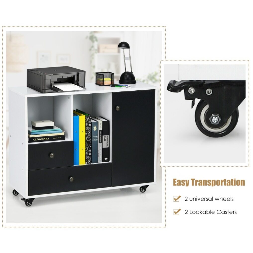 Considerable storage and display spaces have been offered to you with 2 open shelves, 2 concealed adjustable cubbies, 2 drawers, and a wide cabinet top. 4 steel casters make this lateral filling cabinet more convenient to rearrange locations while adding more stability with braking systems. With a bulky load-bearing of 85kg in total, this portable printer stand is suitable as an office filing organizer, a kitchen rolling buffet, a storage sideboard, and so on. In addition, this high-quality cabinet requires manual assembly and minimal maintenance.