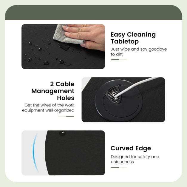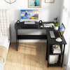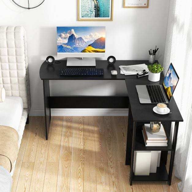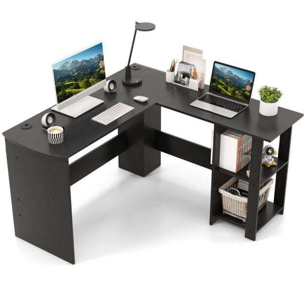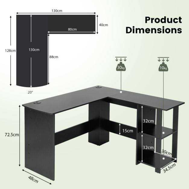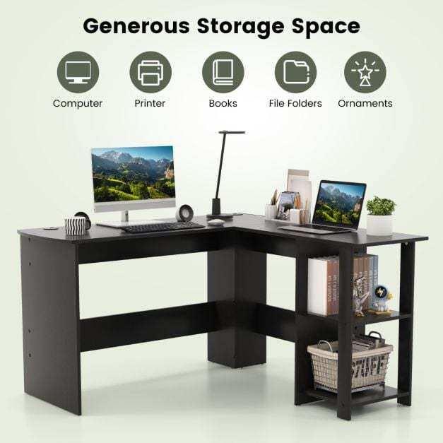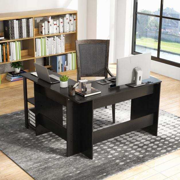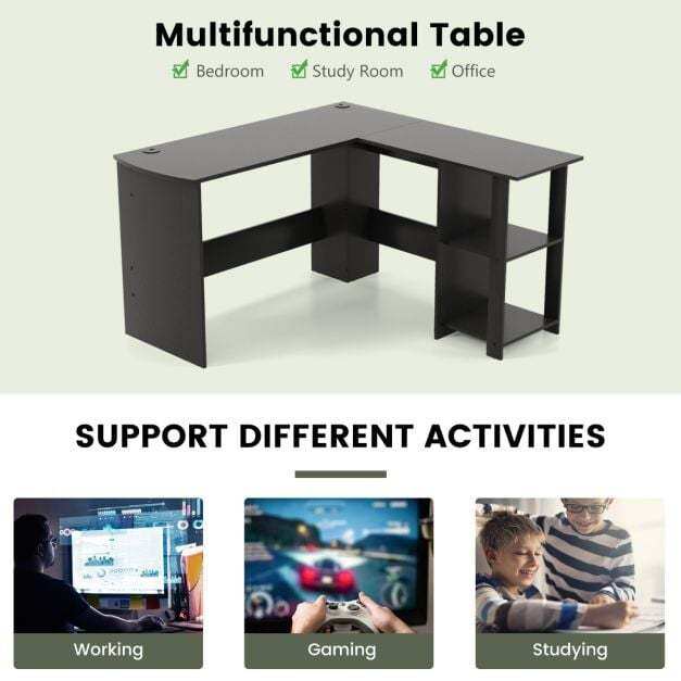 ● Open Shelves and Cable Management Holes: This L-shaped home office workstation is equipped with 2-tier open shelves to provide additional storage space and keep your various items well organized. Besides, the desktop features 2 independent cable management holes, which are convenient to organize the messy wires and reduce clutter.