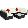 It contains 2 corner sofas, 4 armless sofas and 1 coffee table, which creates sufficient space to let your family and friends gather together. During outdoor use, the hand-woven PE rattan and rustproof metal frame make this outdoor furniture set durable enough for longer service. What's more, the tempered glass tabletop not only provides ample space to hold different items but ensures strong stability. Besides, the sofas with sponge padded cushions and pillows are soft and comfortable to sit on. Comes with all the necessary hardware for easy assembly. Please do not tighten all the screws until all the holes are aligned.