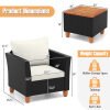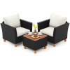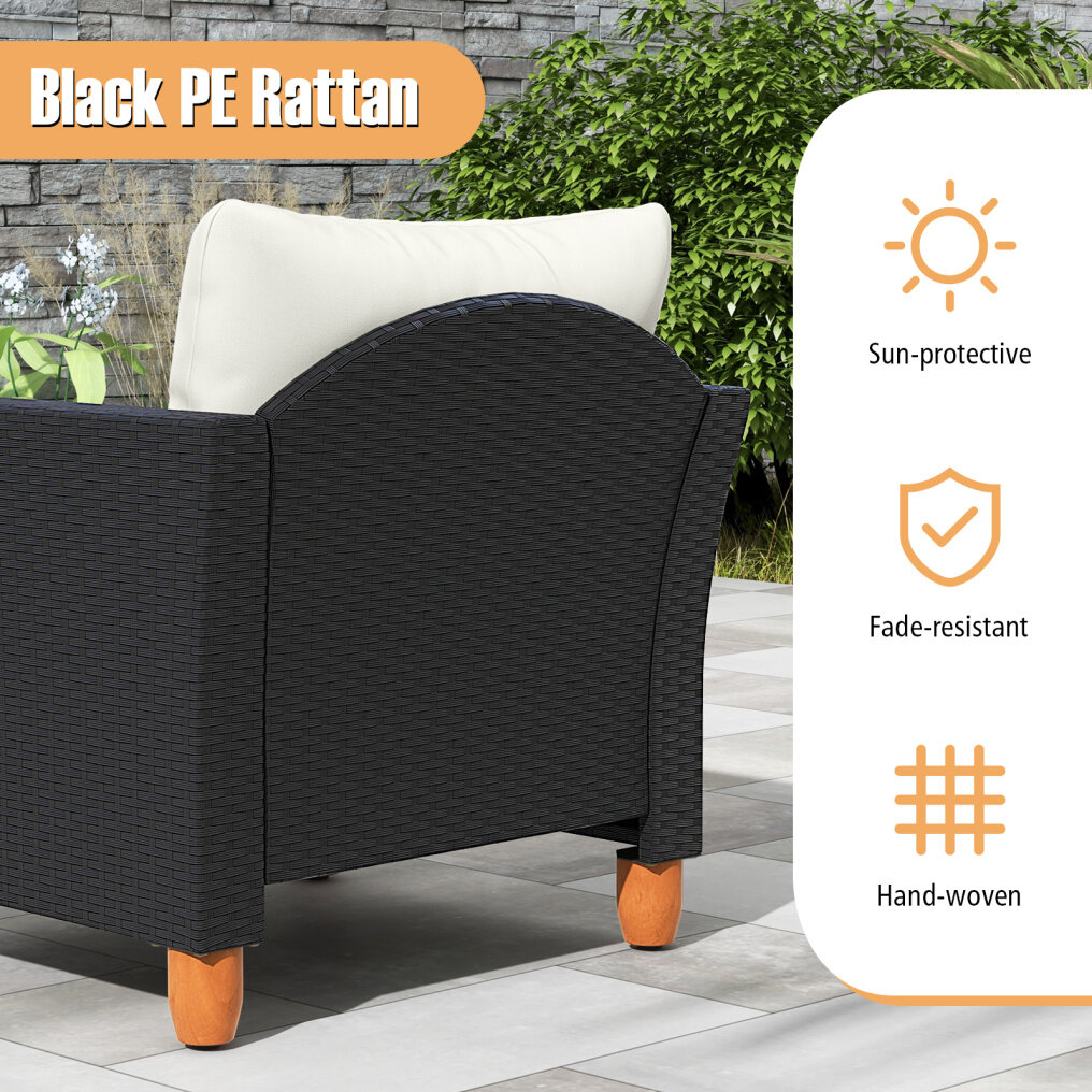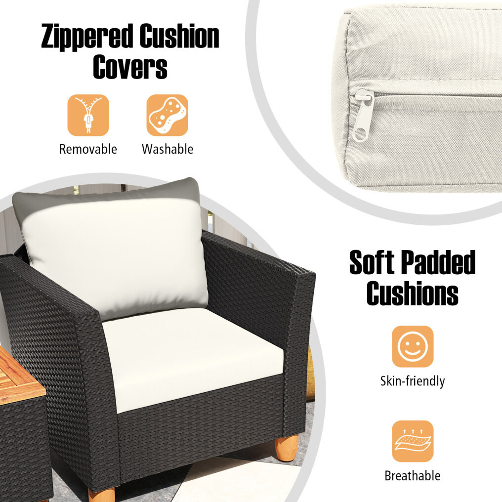 And the feet are made of solid wood which adds sturdiness to the set. They also can be adjusted to apply for uneven ground. Plus, the sofas are equipped with a back and seat cushion adds excellent comfort for you. And the cover of the cushion is designed with a smooth zipper for removing and cleaning easily. The coffee table is equipped with a thick acacia wood top for placing foods, drinks, or decors. This rattan furniture set will go well with various home styles, which is a perfect complement for your house.