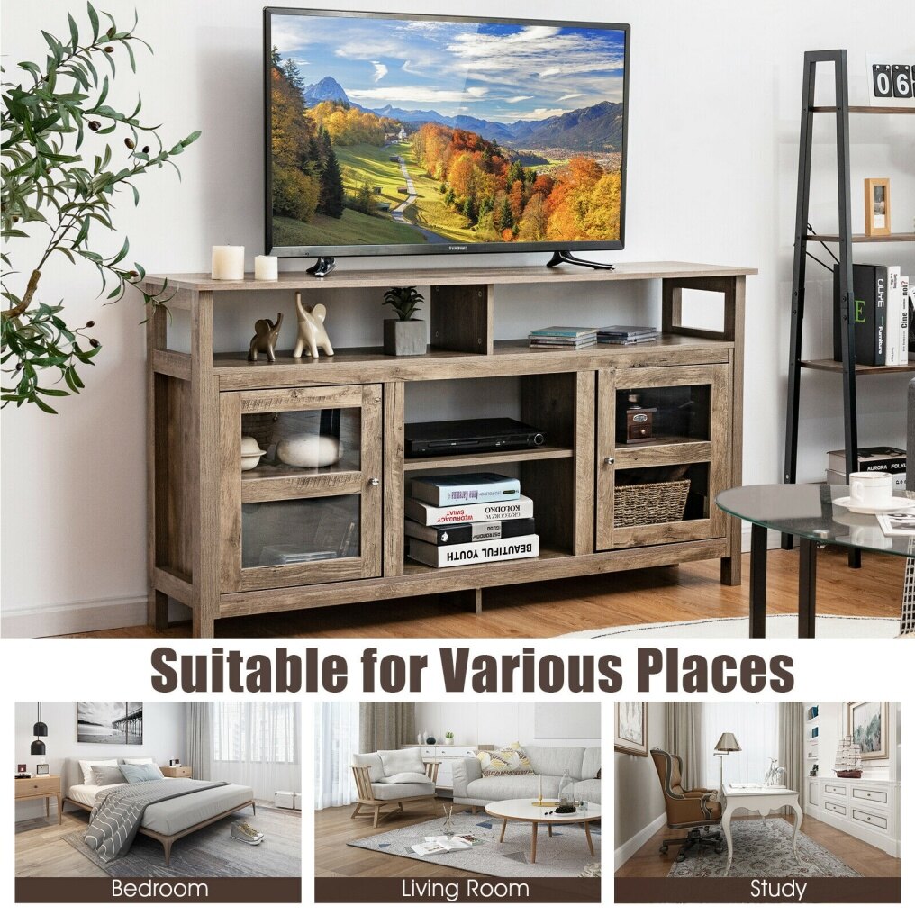 ● Large Storage Space and Spacious Top: The tabletop of this chic TV stand is large enough to accommodate a flat screen TV up to 65". Moreover, featuring 2 cabinets and 4 open shelves, this console table offers ample space to organize all of your video and audio components along with your DVD and game collection.