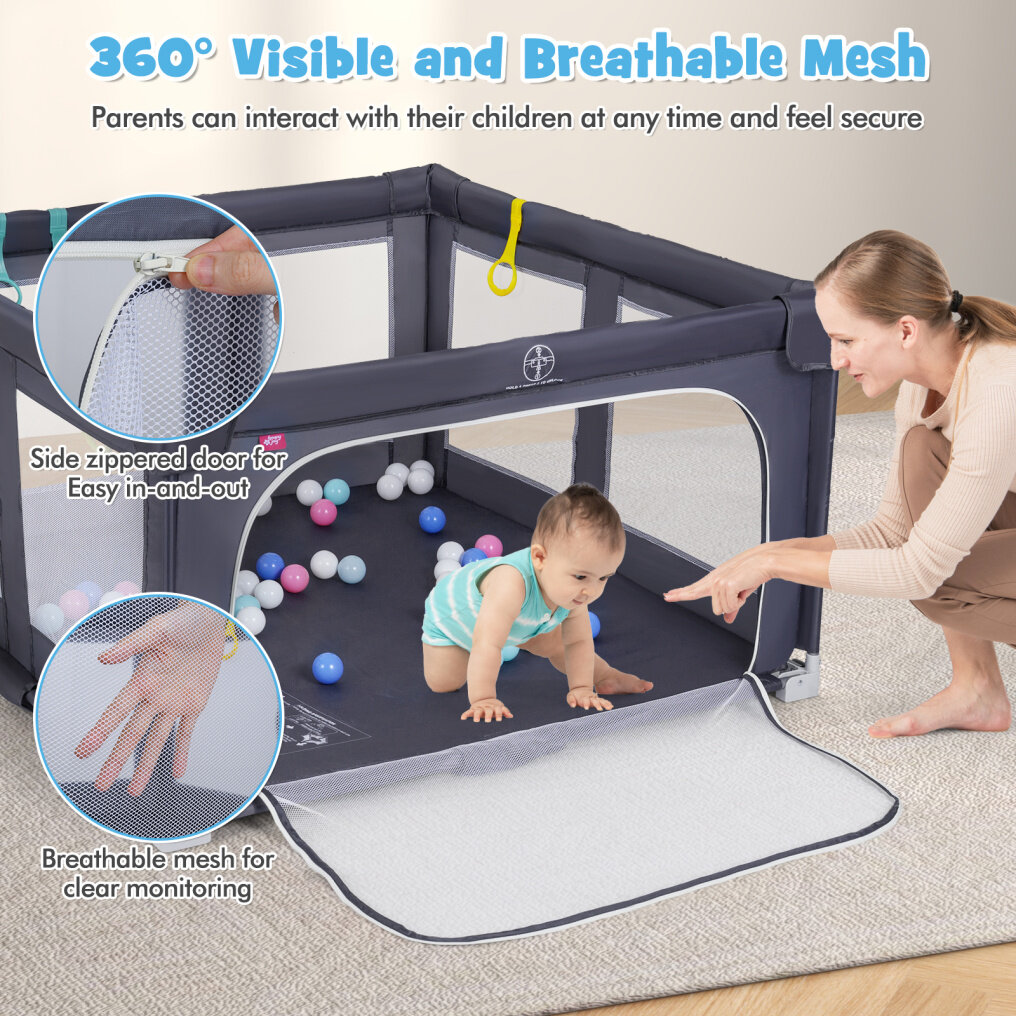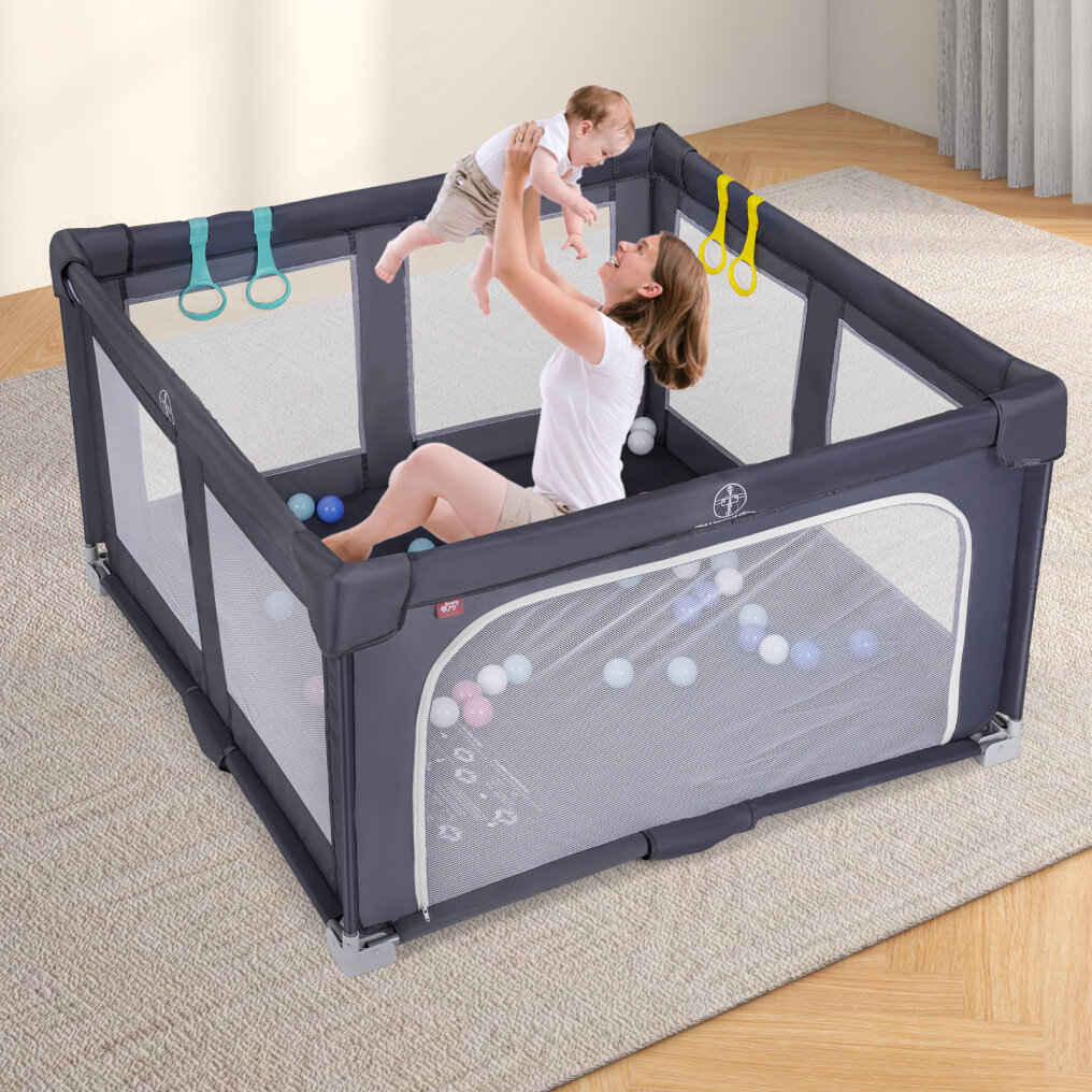 Easy Access and Engaging Fun: This play yard is equipped with a convenient zip-open side door that offers easy in-and-out for babies and toddlers. Included accessories are 50 colorful ocean balls and 4 pull-up rings to promote physical activity and motor skills development.