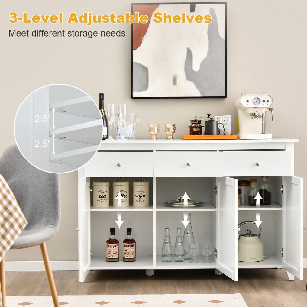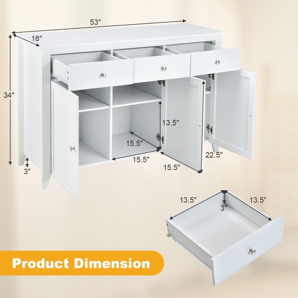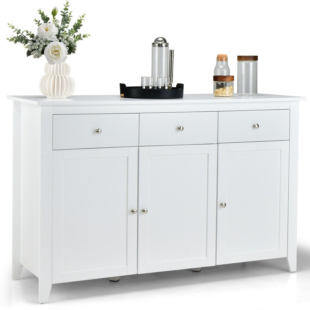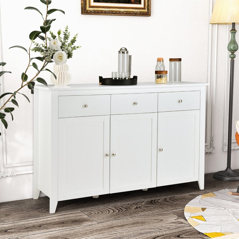 ● Sideboard with Adjustable Shelves: The shelves inside 3 cabinets can be adjusted in 3 different heights so that items of various heights can be stored in this sideboard. And the cabinet door is equipped with round knobs for handy opening and closing. With simple and classic design, this sideboard matches to most decoration styles.