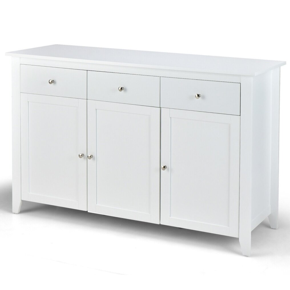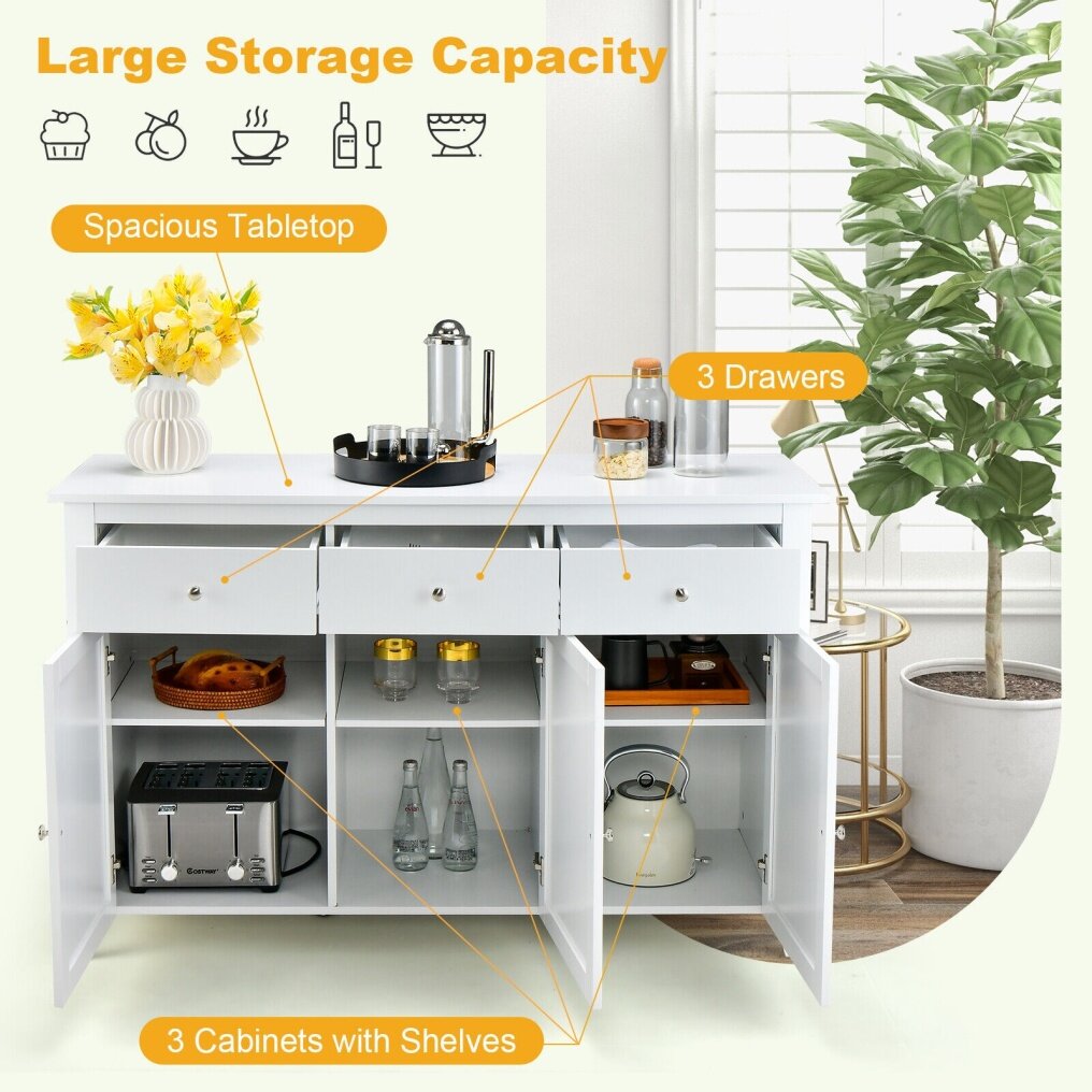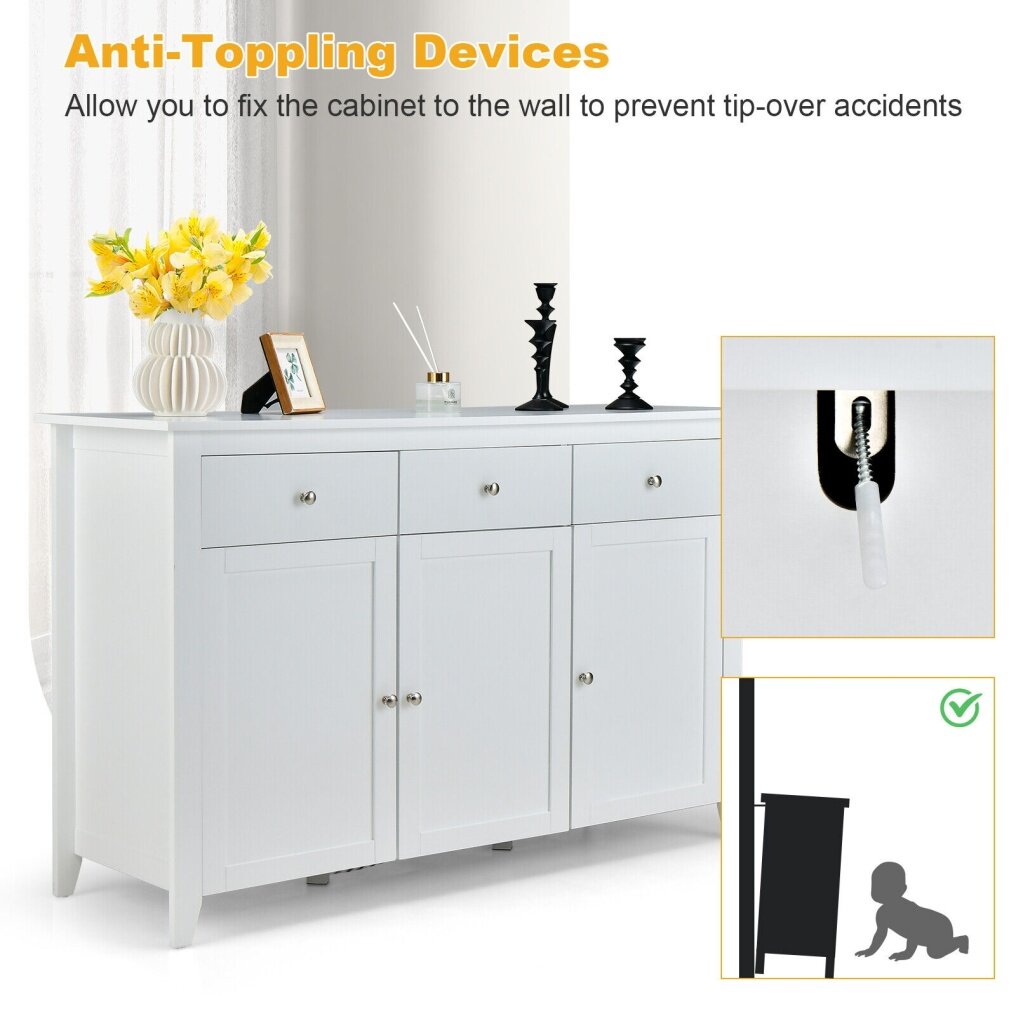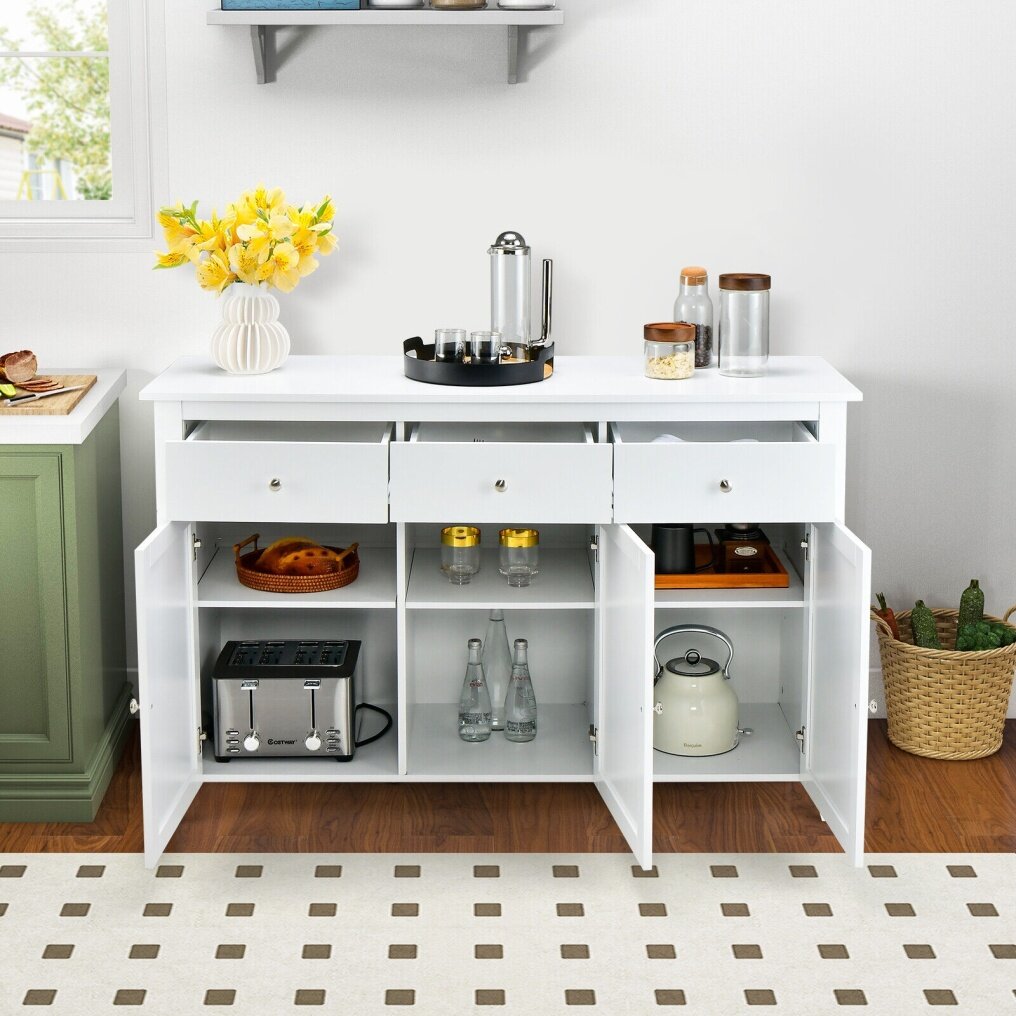 ● Sideboard with Adjustable Shelves: The shelves inside 3 cabinets can be adjusted in 3 different heights so that items of various heights can be stored in this sideboard. And the cabinet door is equipped with round knobs for handy opening and closing. With simple and classic design, this sideboard matches to most decoration styles.