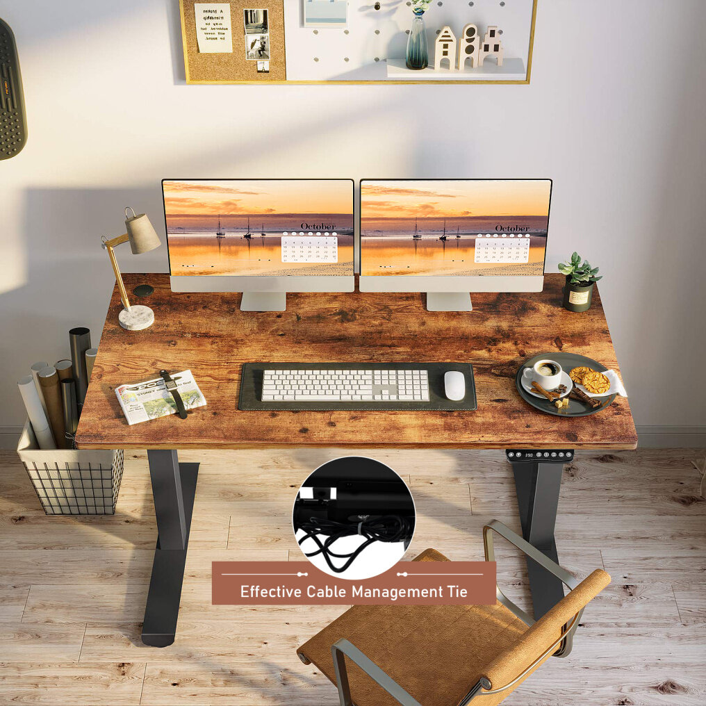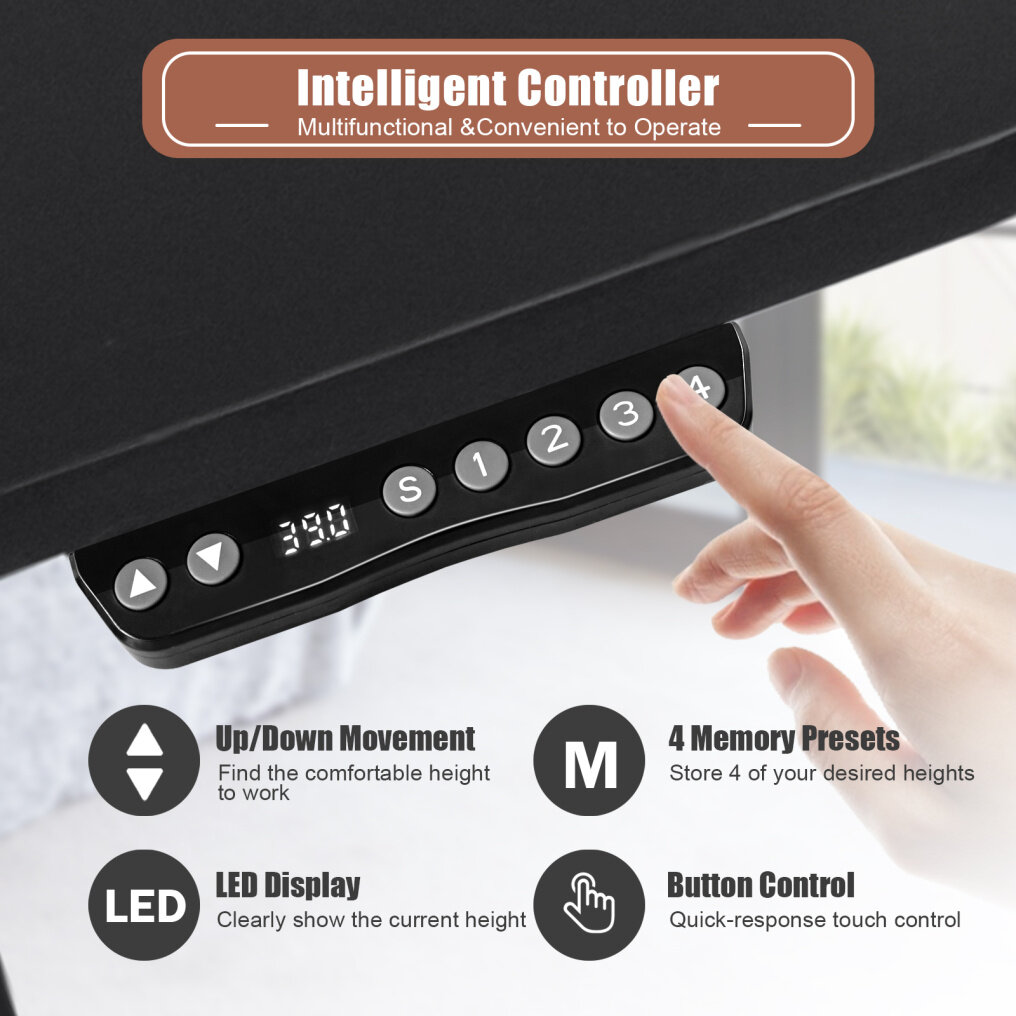 Adjustable legs with powerful lifting system will meet all your different height needs. The intelligent push-button controller features 4 programmable memory settings and up/down movement controls. You can easily preset your desired sitting position with the memory function. It not only kills the pain of neck and back but also enables you to stay awake and alert after long hours of intense work. Constructed with heavy-duty steel, this stand up desk with 4 adjustable foot levellers is very sturdy and stable, which can stand the test of time. The quiet operation will also win the applause from you and never fail your passion for quietness. Moreover, 46’’ to 59’’ adjustable width will perfectly match with various tabletop sizes.