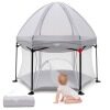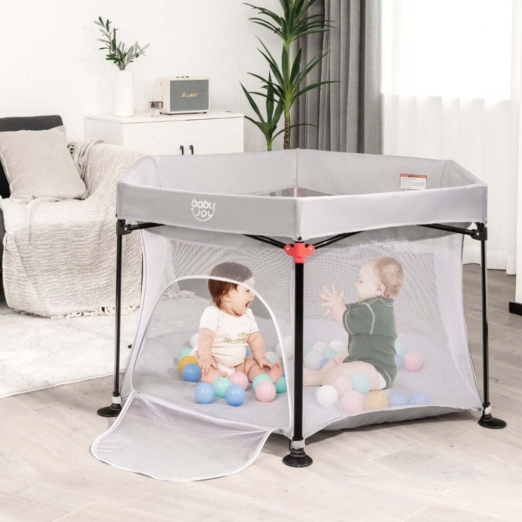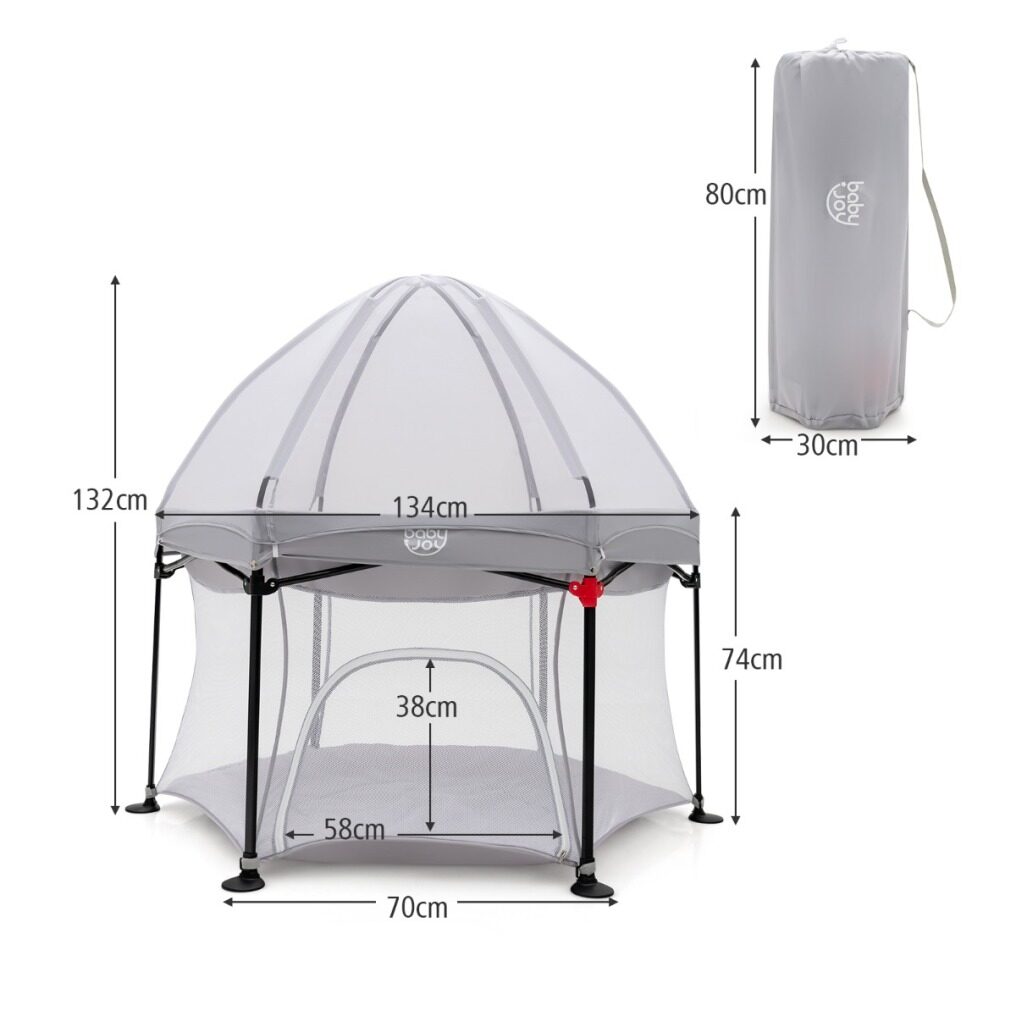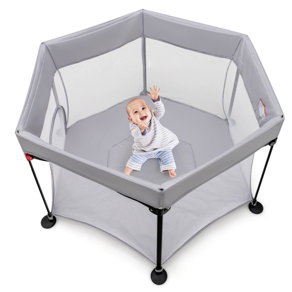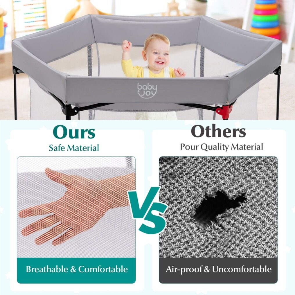 Safe and Stable Structure: Supported by a sturdy rust-resistant steel frame in a stable hexagonal structure, this play yard features 360° all-round surrounding mesh wall, providing parents with a good view to keep an eye on the conditions of their children at any time. In addition, 6 non-slip foot pads provide better stability and protect the floor from scratches.
