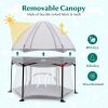 Removable Canopy & Padded Floor Mat: The playpen features a removable canopy made of durable oxford fabric and breathable mesh, offering sun protection and good ventilation. In the middle of the playpen is a padded floor mat, filled with soft sponge, which makes children feel more comfortable when playing in the playpen.