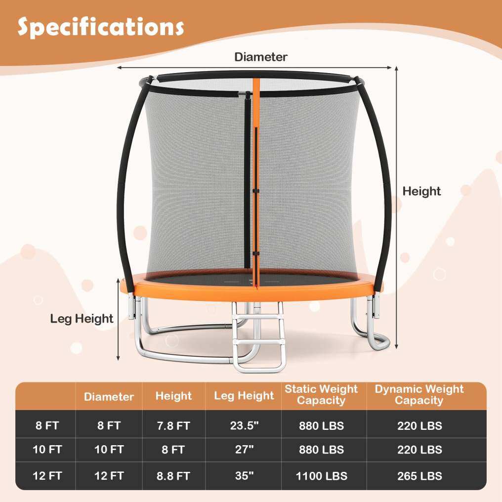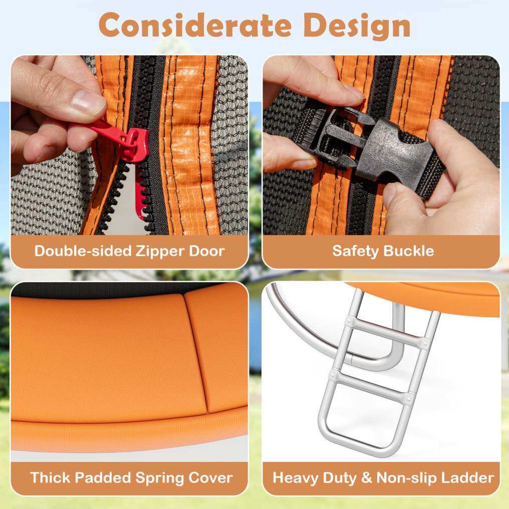 High-Quality Materials: This trampoline includes a tear-resistant enclosure net with a double-headed zipper door and safety buckles. The ladder is built with anti-slip textured steps for easy access while the thick padded spring cover provides safety and comfort.