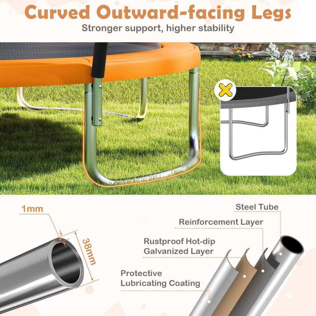 ASTM Compliant Safety: More space, more safety. This trampoline features a safety design of curved poles which are wrapped in anti-collision foam sleeves. Moreover, the no-gap design securely attaching the net to the mat, preventing hands and feet from being pinched.
