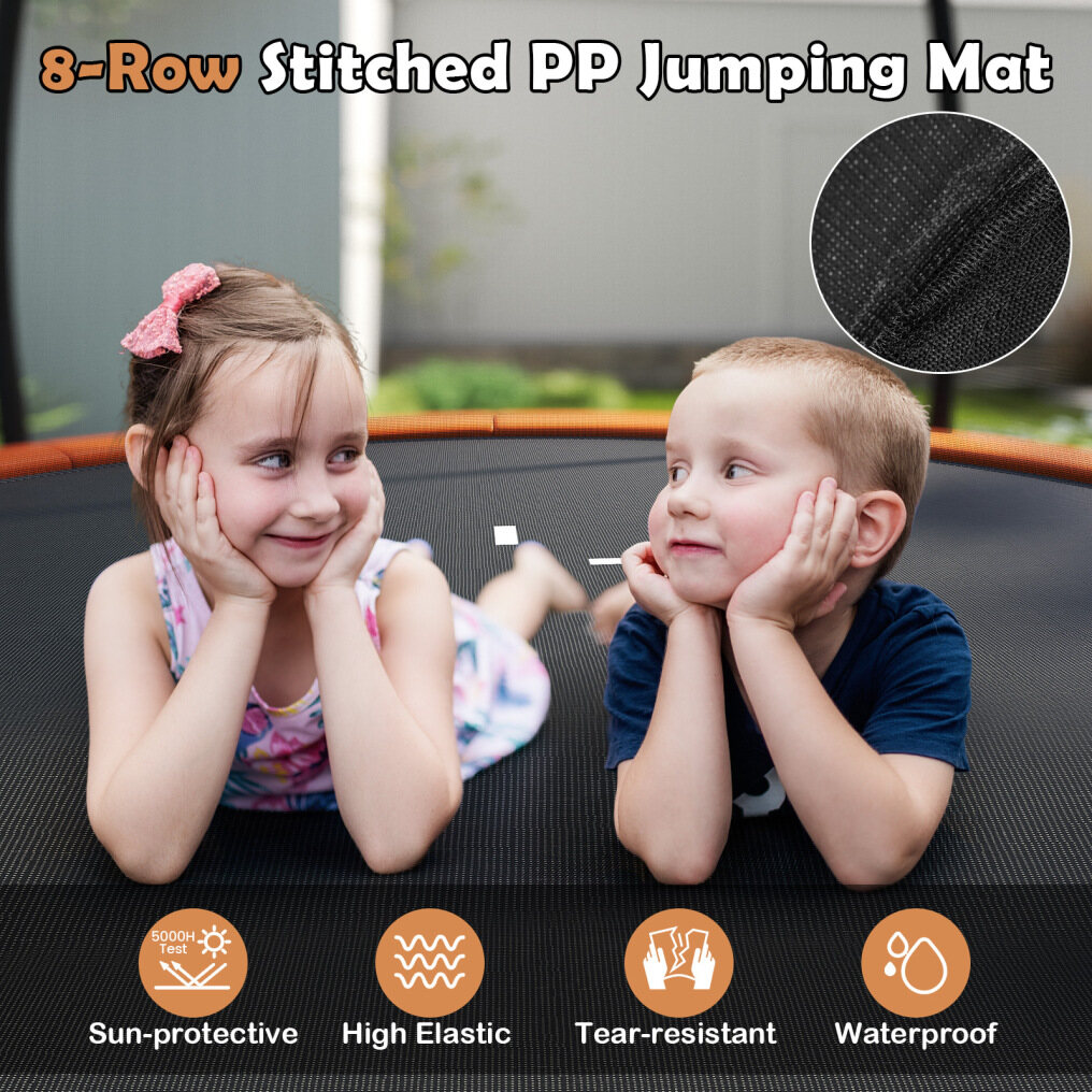 Reliable Safety: More space, more safety. This trampoline features a safety design of curved poles which are wrapped in anti-collision foam sleeves. Moreover, the no-gap design securely attaching the net to the mat, preventing hands and feet from being pinched.