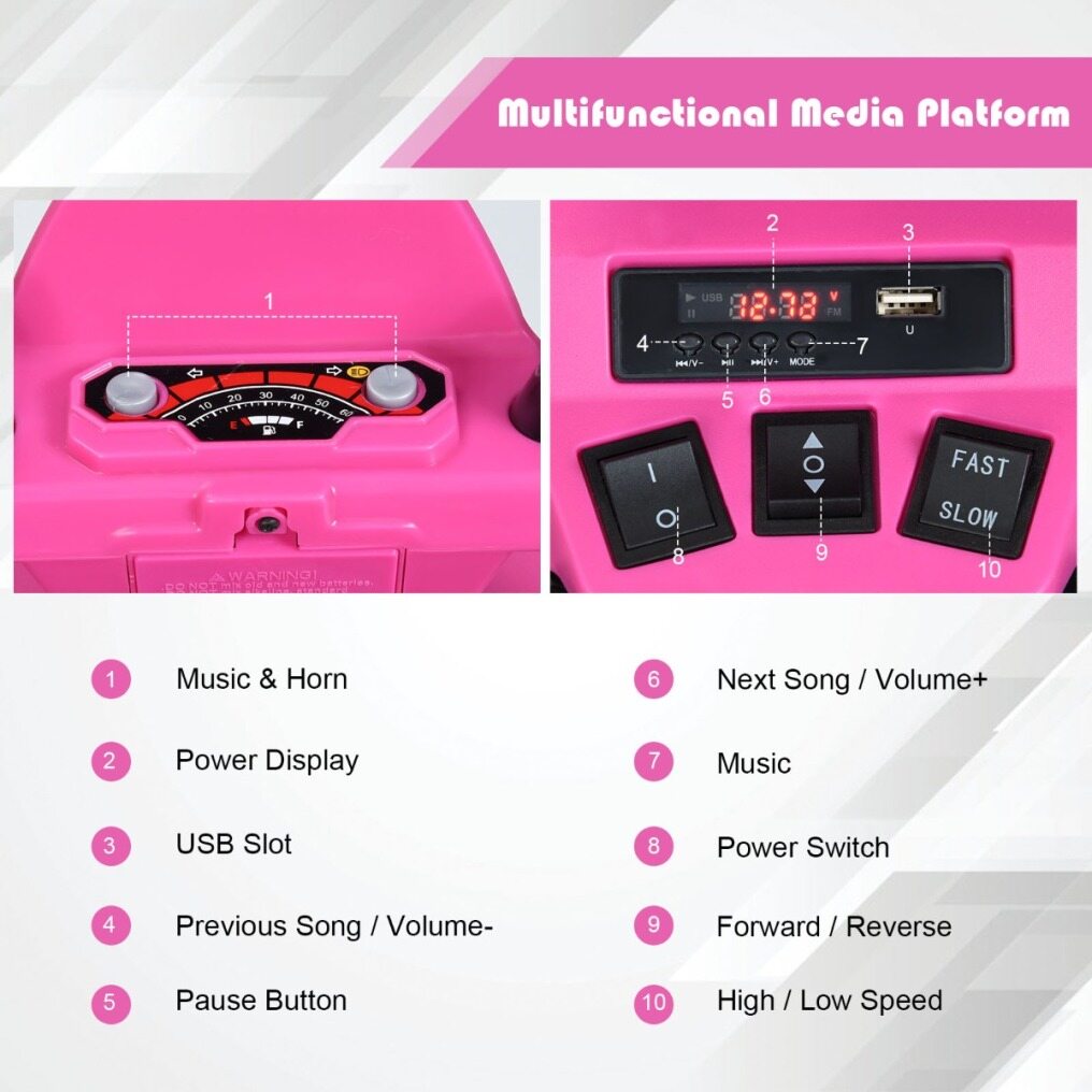 Cheering Music and Story for Infinite Fun: The electric ATV of rechargeable design gives your kids the ability to drive for long time after a full charge. Power display reminds you to get it charged in time. And there are several music and stories, designed to cheer up your kids so that they will not feel bored. USB slot and Bluetooth function make more resources available further.