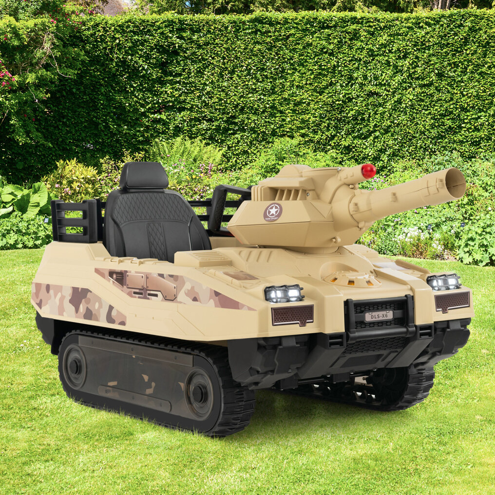 ● Realistic Kids Ride-On Tank: This kid's tank has a rotatable turret for simulated firing, allowing kids to fully experience the fighting fun. They can take out the missiles from the missile box, place them in the bomb chute, rotate the turret with 40° to aim, and then press the firing button to enjoy the imaginary battles.