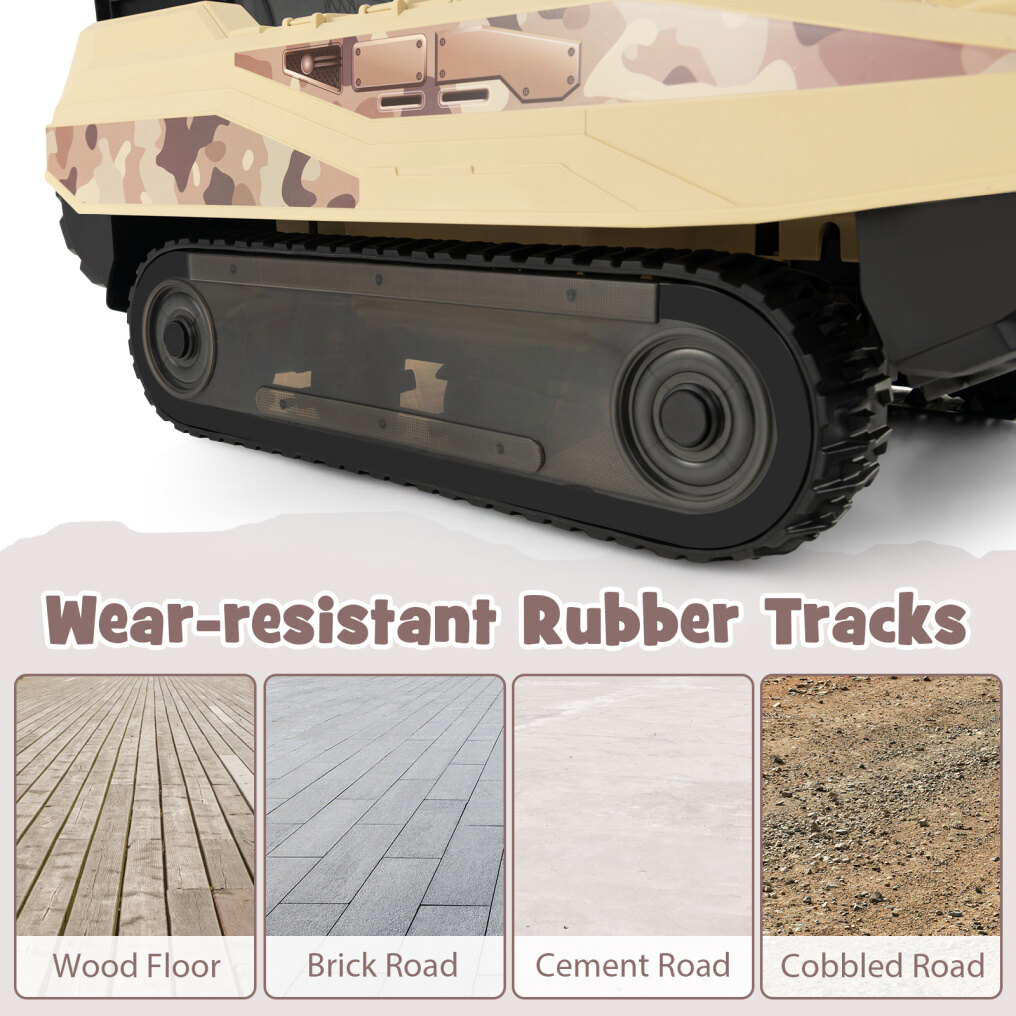 ● Great Driving Performance: 12V 12AH rechargeable battery and strong motors ensure a speed of 1.2-3.1 mph and long-lasting playing time. Meanwhile, 2 wear-resistant rubber tracks help the tank to smoothly move on the wood floor, brick road, cement road, grass land or cobbled road. It also has 2 rear portable wheels for movement after use.
