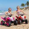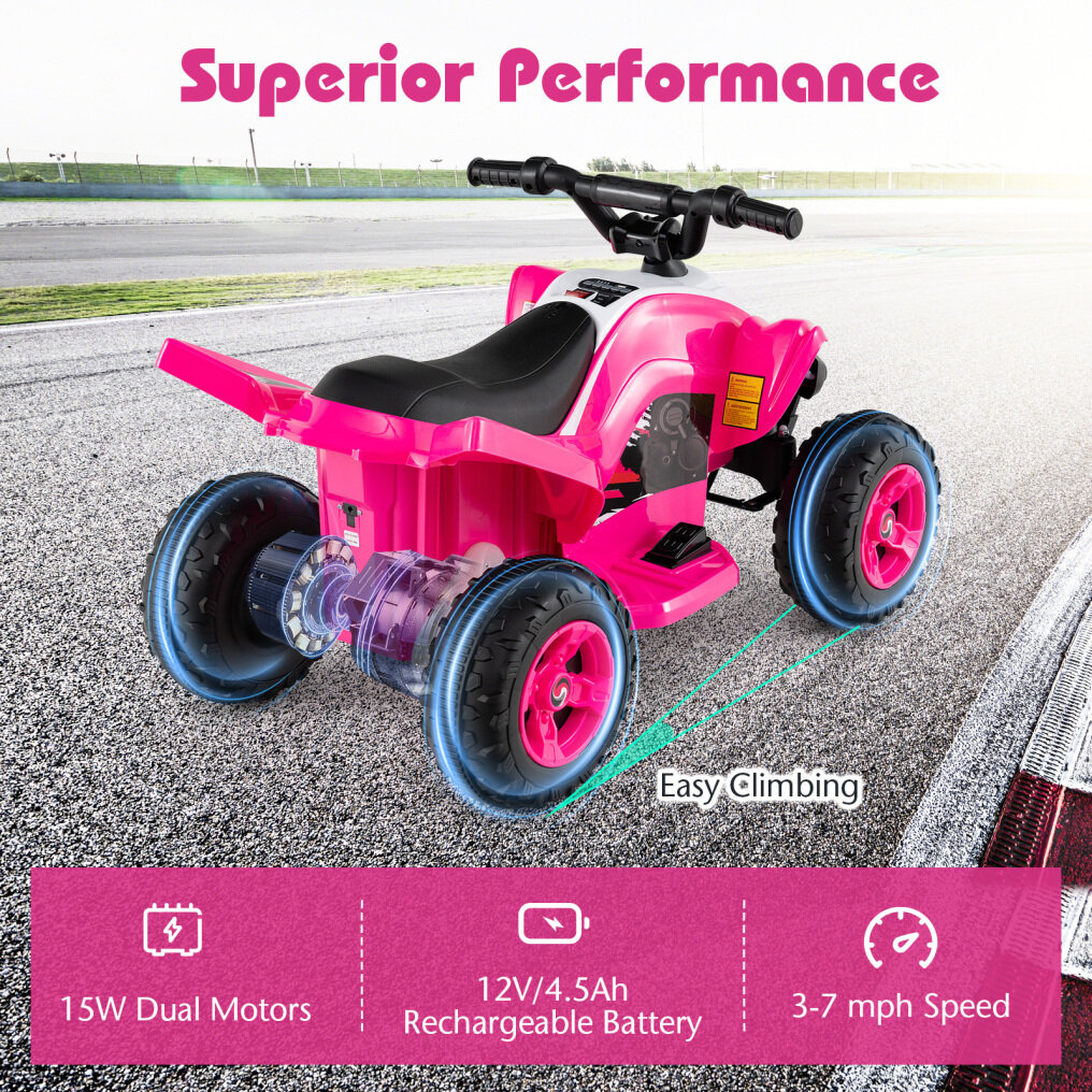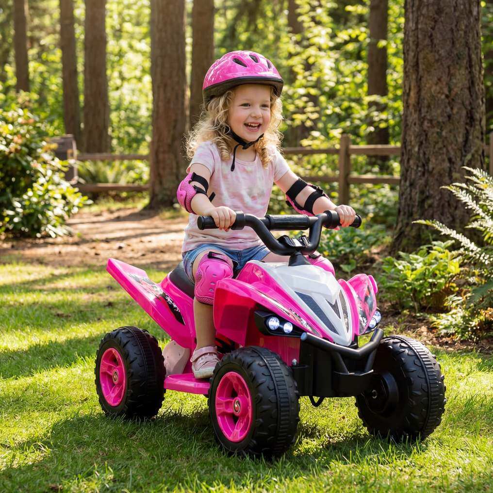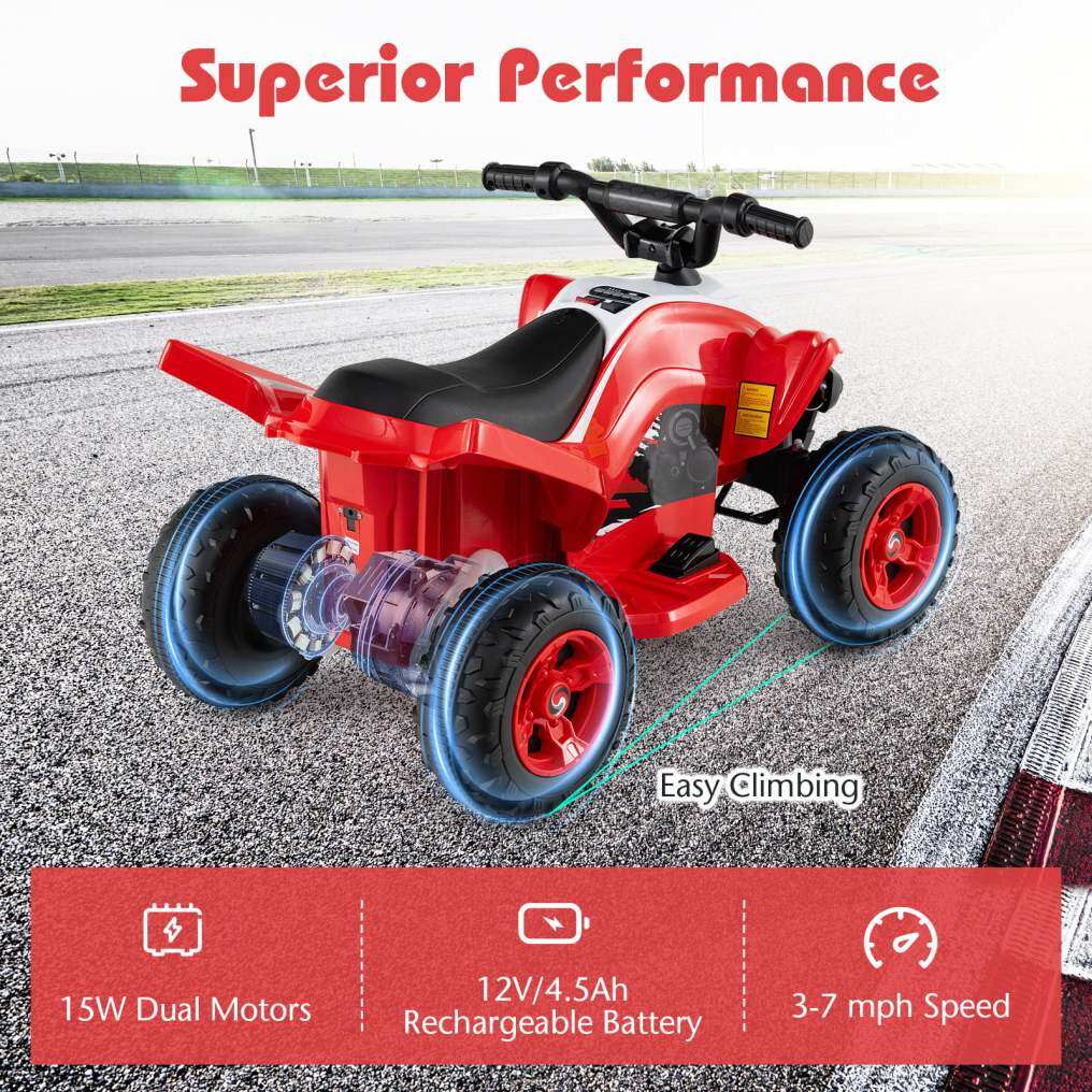 ● 4-Wheeler Ride on ATV: The kids ride on ATV allows little ones to experience excitement with its dual 15W powerful motors and a 12V/4.5Ah rechargeable battery, ensuring a robust and thrilling ride at 3-7 mph speed. Plus, the one-touch start foot pedal makes it easy for young racers to jump into action and enjoy the ride.
