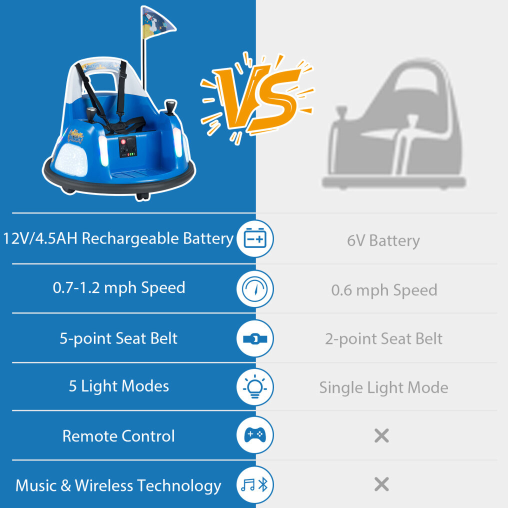 ● Safety Comes First: Equipped with 5-point seat belt, the bumper car ensures children remain safely strapped in throughout the ride. Soft bumpers surrounding the vehicle help absorb impacts and protect during collisions while high back design offers excellent support for young riders.