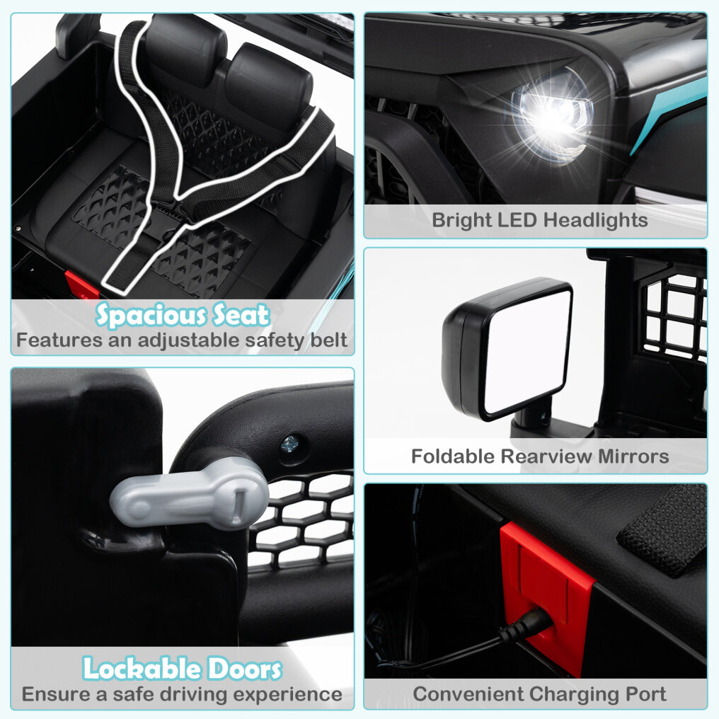 ● Safety Is Always Considered: The electric vehicle includes a spacious seat that features an adjustable safety belt, keeping your child secure in place during each adventure. Moreover, the lockable doors can prevent accidental opening to ensure a safe driving experience and offer you peace of mind.