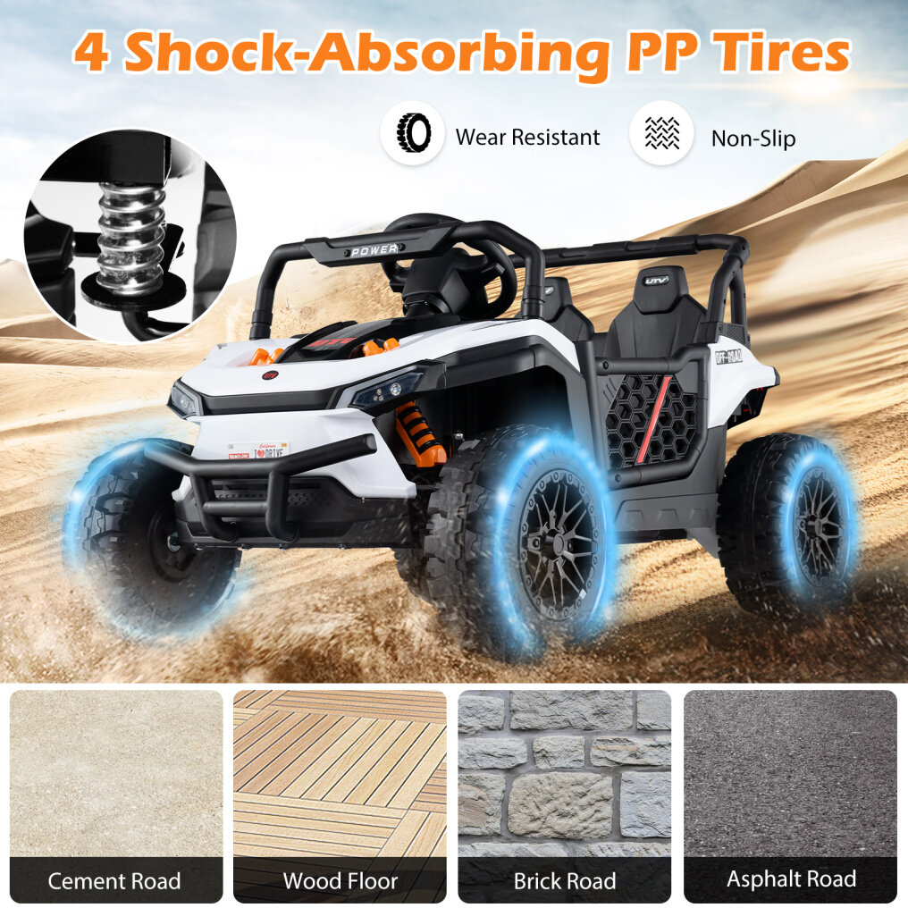 ● 4 Shock-Absorbing PP Tires: This toddler off-road UTV features 4 wear resistant and non-slip PP tires, which is also designed with springs for shock absorption. As a result, the ride on truck offers smooth and stable ride across various surfaces, such as cement road, wood floor, brick road, asphalt road and so on.