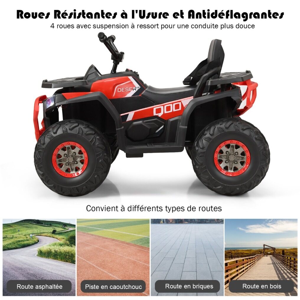 Wear-resistant wheels for off-road driving : Equipped with 4 wear-resistant wheels with spring suspension, the electric vehicle allows your kids to ride on almost any terrain, such as rubber, concrete roads, wooden walkways, etc. Your kids can enjoy riding whether indoors or outdoors. Besides, 4 large wheels ensure good stability and safety.