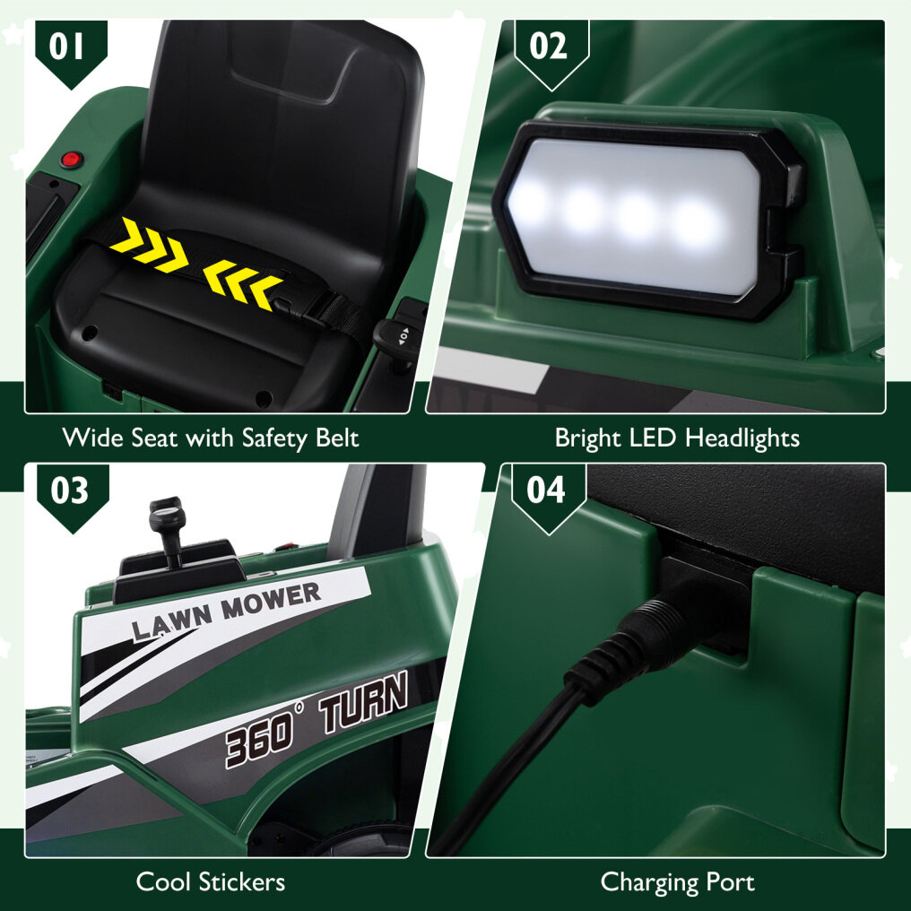 ● Powerful Performance: Powered by dual 35W motors and a 12V/4.5Ah rechargeable battery, the riding mower boasts reliable performance for extended playtime. With a top speed of 1.7 mph, it provides a safe yet exciting driving experience.