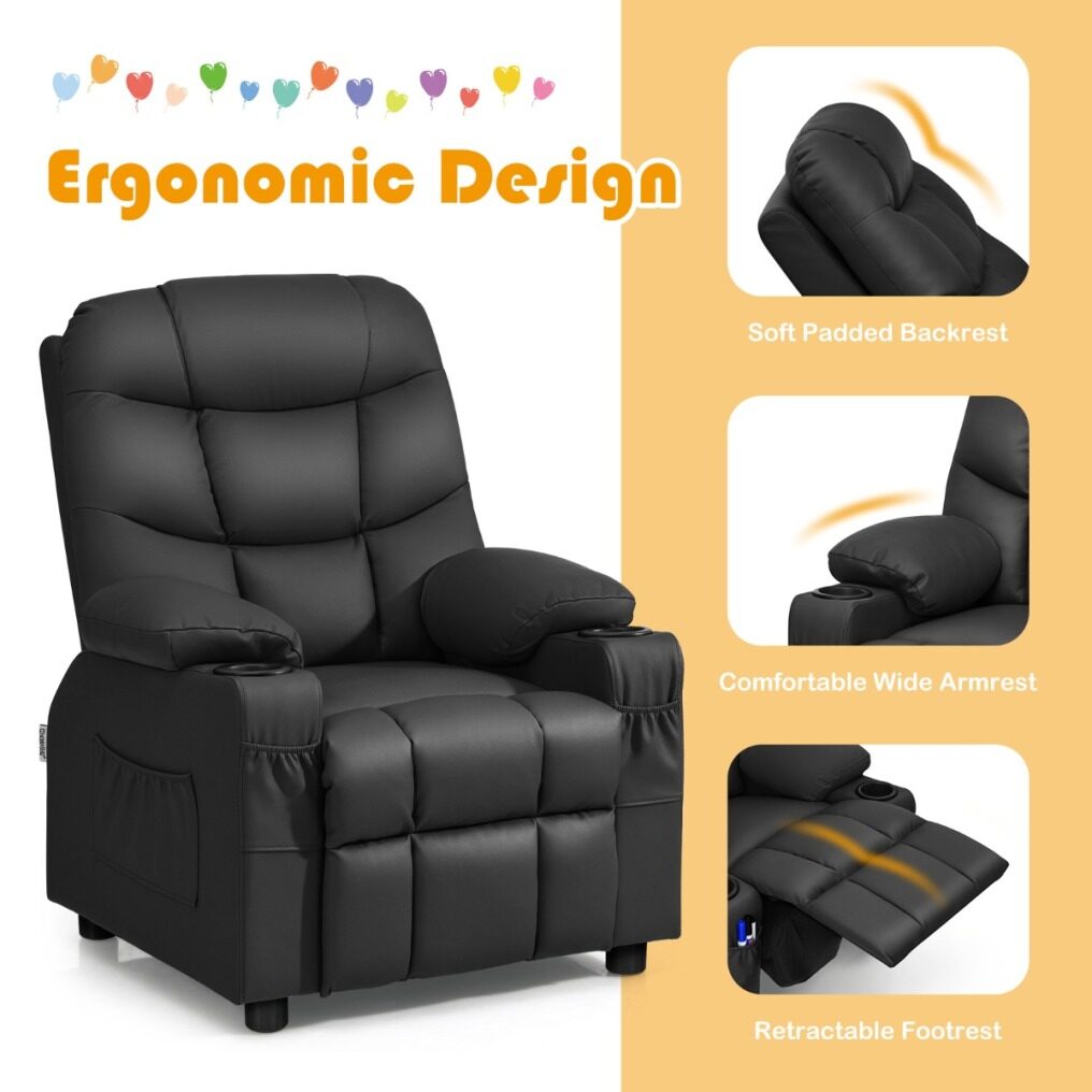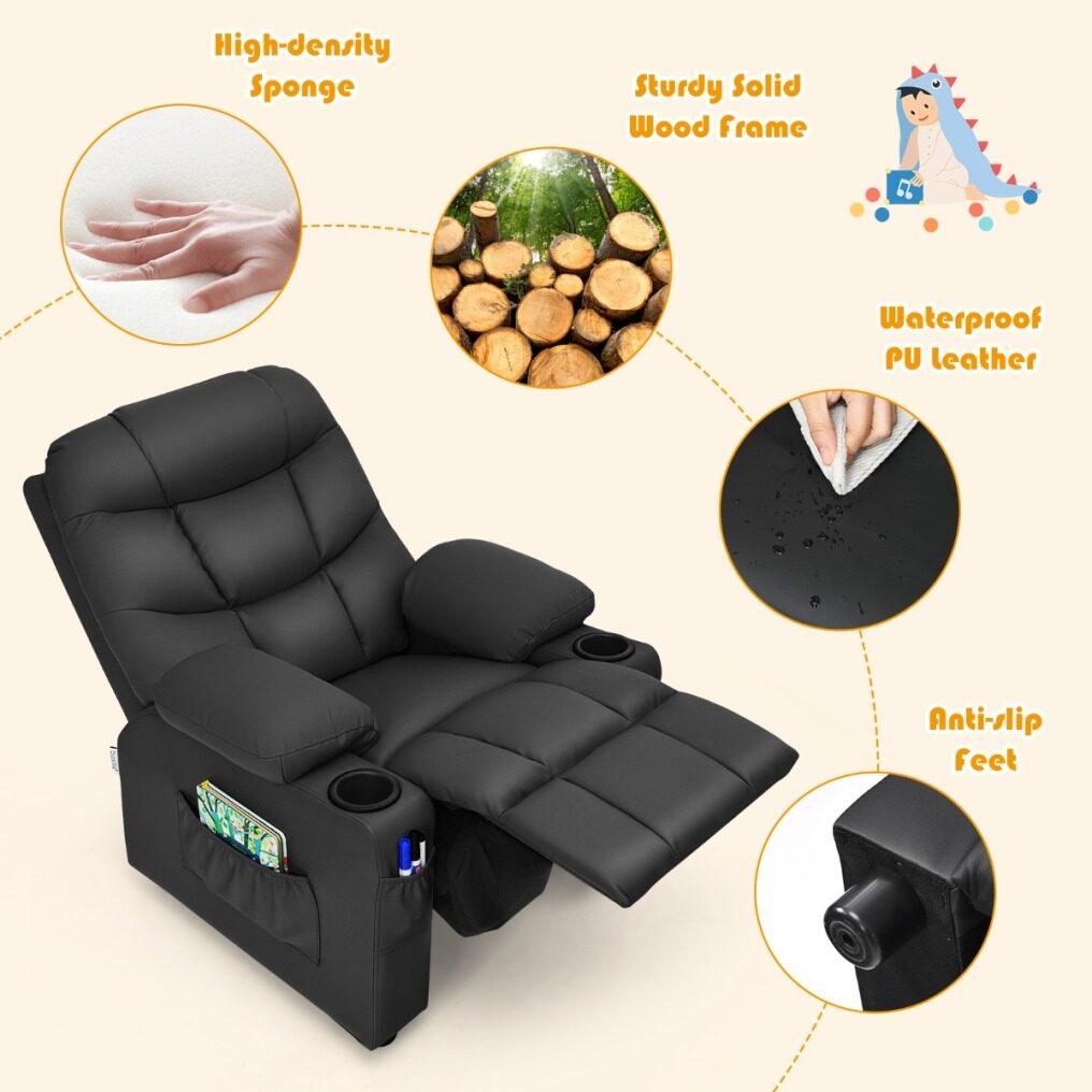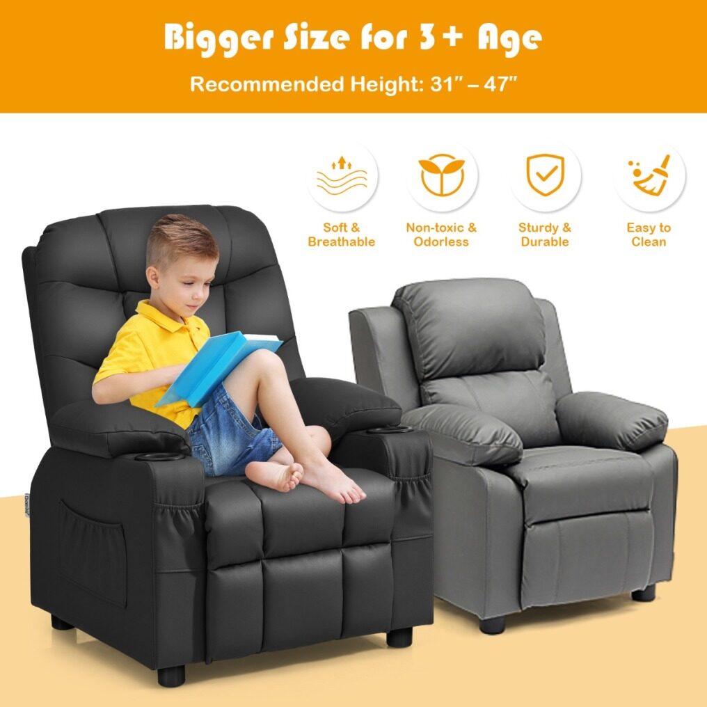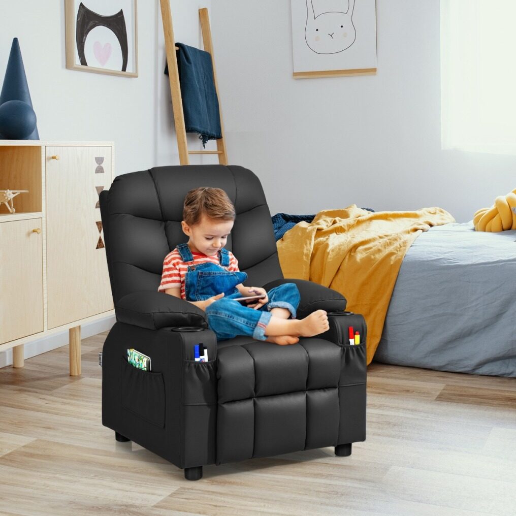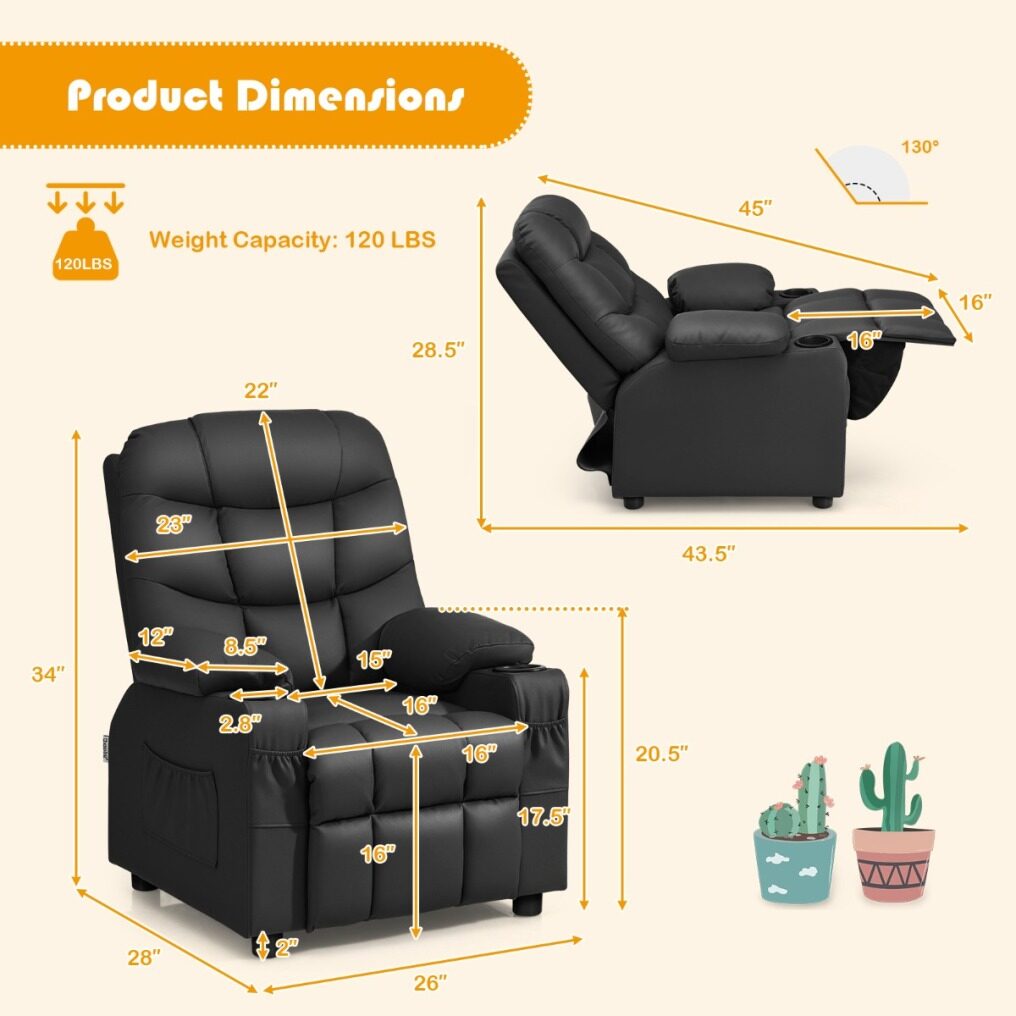 Convenient Cup Holder & Side Pockets: Compared to other ordinary chairs, our kid's armchair comes with a cup holder and 2 side pockets for convenient use. The cup holder in armrest of the recliner keeps the water within arm reach while 2 side pockets facilitate the placement of food, books and other daily items.