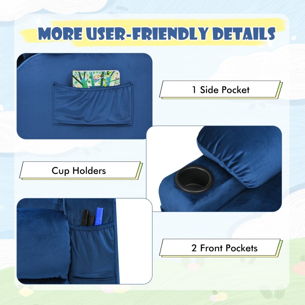This recliner is easy to operate for sitting or lying by adjusting the backrest and footrest, so as to meet kids' different needs of reading, watching TV, napping, etc. Premium velvet fabric, sturdy solid wood frame, and thick sponge padding ensure that the chair can withstand long-term use. Featuring an ergonomic high backrest and wide armrests, the sofa will offer extra comfort and relaxation.