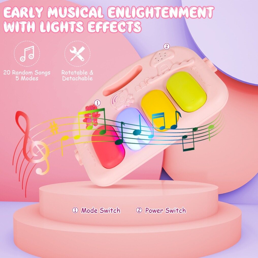 【Kick & Play Musical Piano with Lights】 Babies can kick the musical piano to play songs and make animal sounds or play with their hands for early piano impression (battery required not included). The musical piano is angle-adjustable and detachable for versatile use. The lighted notes provide gentle stimulation and can change among 4 colors.