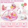 Accompanying your baby from newborn to toddler, this playmat allows the baby to sense and discover from laying, tummy down, sitting, and taking along. The 5-mode piano also has much music and magical lights for hearing and visual stimulation, and visual stimulation while the 5 hanging animals are prepared for babies to grab, teethe and rattle. You can easily set up and take down each part of the mat and reset them with cribs, strollers, and more. To make sure babies’ safety, this activity gym is made with superior materials, design with round edges, including a 3-lay washable mat for comfort.