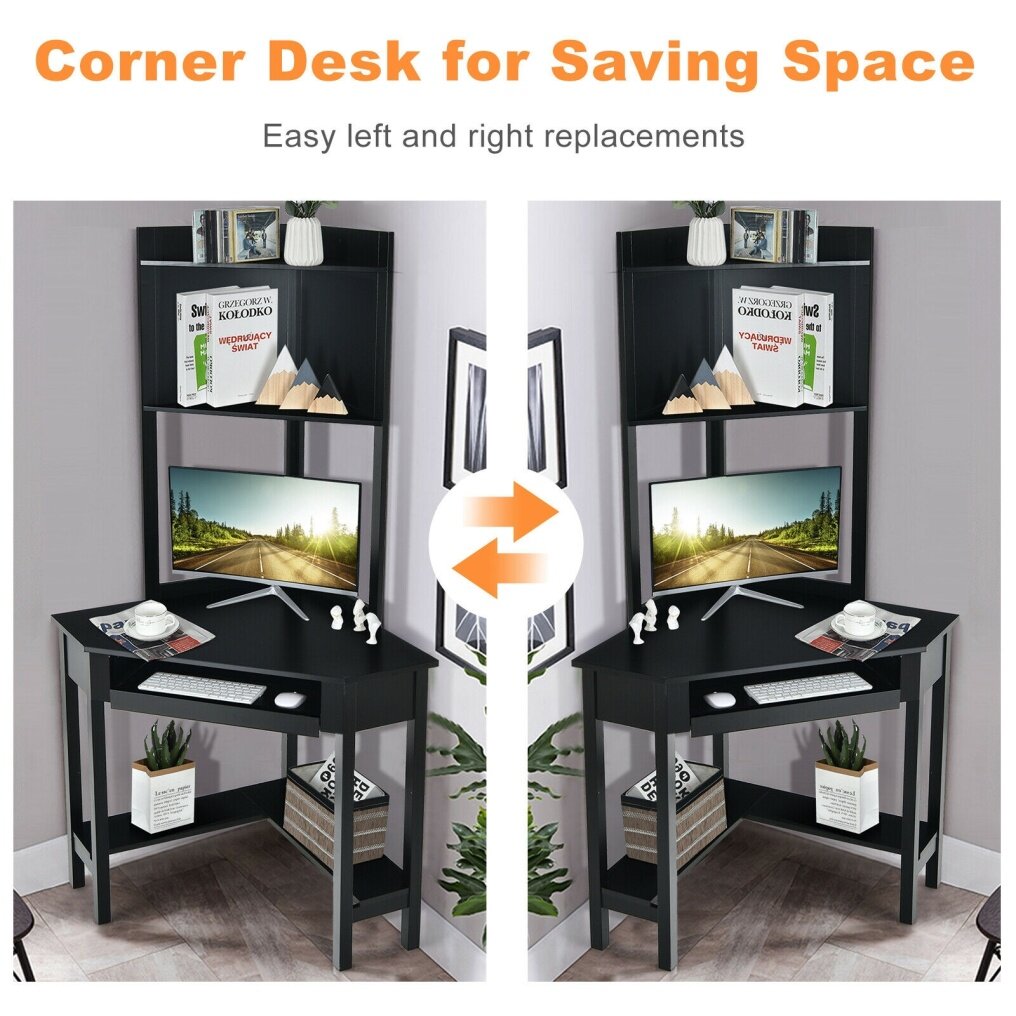● Wide Desktop and Convenient Keyboard: The spacious triangle desktop provides enough space for your working needs and keeps you away from messy environment. The keyboard tray with metal slide rails underneath the corner desk is designed to free up more tabletop surface and bring much more convenience in working or studying.