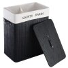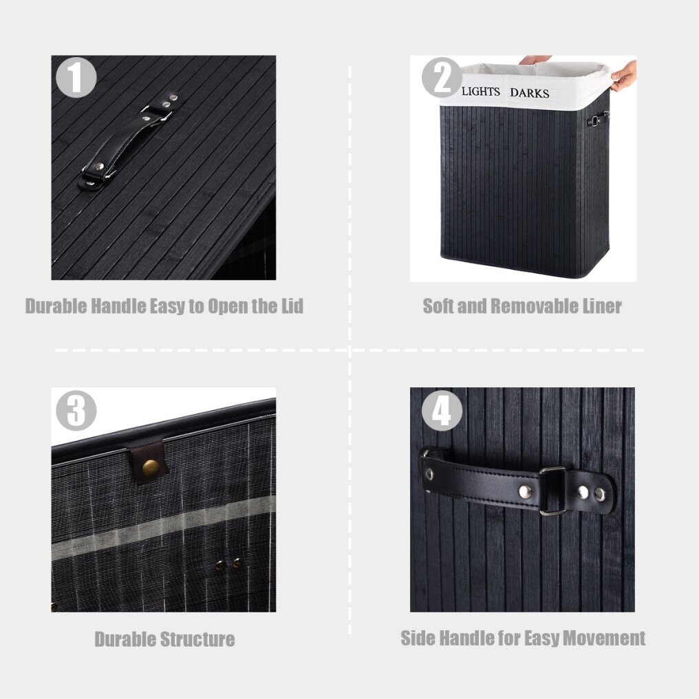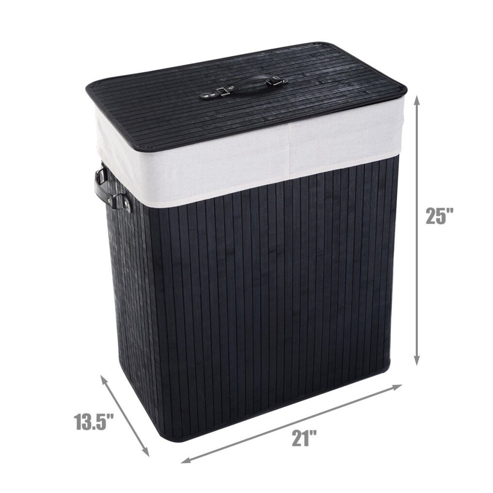 Our double rectangle bamboo hamper laundry basket is good for any laundry for room or home. This double laundry features 2 bins that are perfect for sorting lights from darks. This basket is made of bamboo, which is durable and lightweight. Two PU leather handles on the right and left side make it easy for members to pick it and a detachable lid for easy closure. It simplifies your house working and keeps your home environment clean and tidy